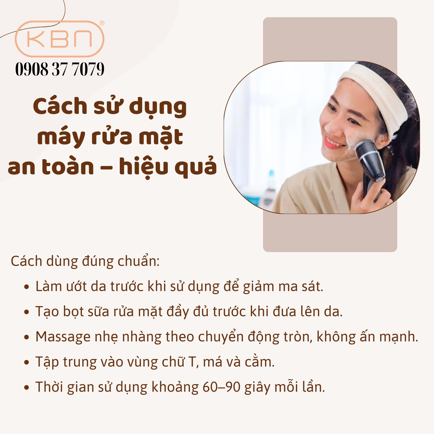 - Thời gian sử dụng phù hợp: Mỗi lần dùng máy rửa mặt nên kéo dài khoảng 60–90 giây. Việc sử dụng quá lâu có thể khiến da bị khô và mất độ ẩm tự nhiên. Nên chia đều thời gian cho từng vùng trên khuôn mặt để làm sạch hiệu quả.