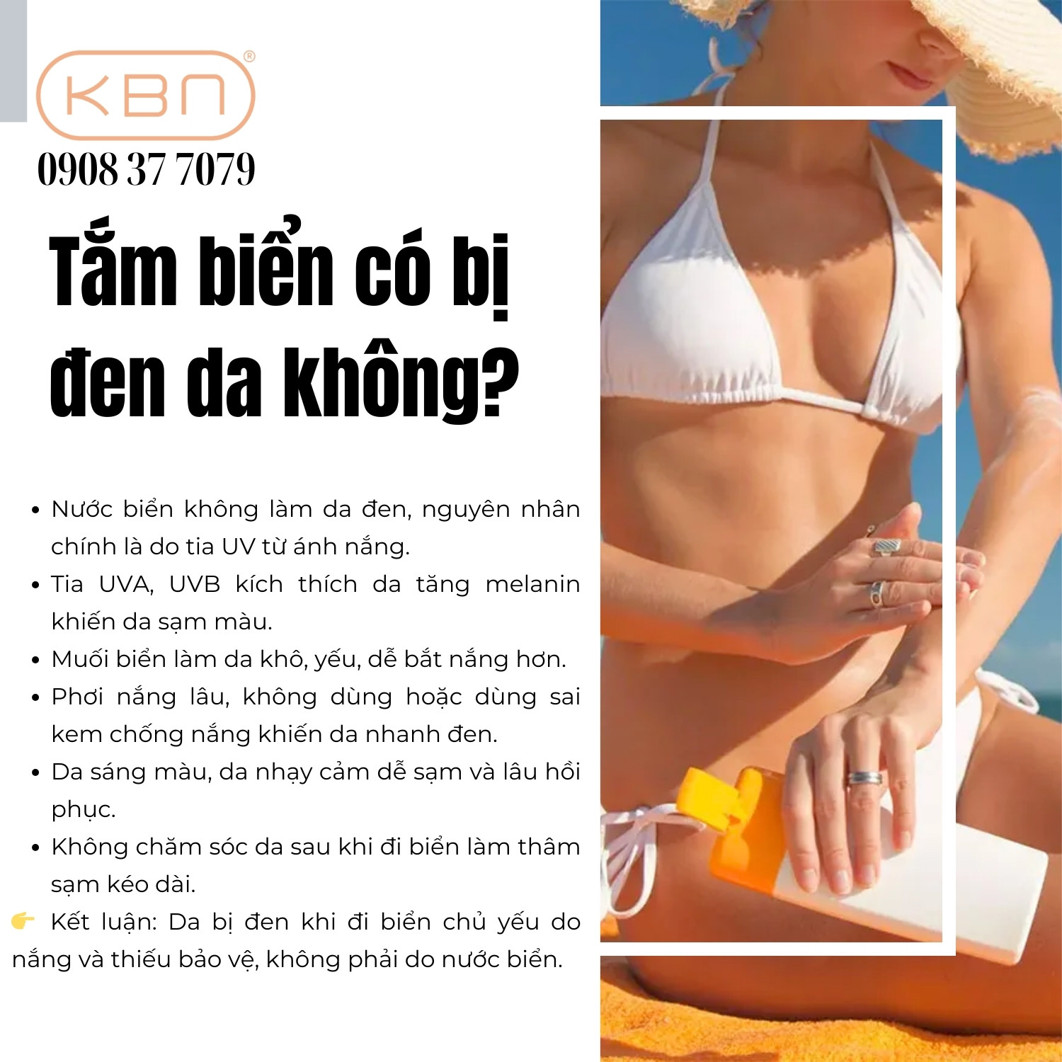 Tóm lại, tắm biển có bị đen da không còn phụ thuộc rất lớn vào cách bạn bảo vệ và chăm sóc da trước, trong và sau khi tiếp xúc với ánh nắng. Nước biển không phải là nguyên nhân trực tiếp khiến da sạm màu, mà chính tia UV mới là yếu tố quyết định đến tình trạng thâm sạm và lão hóa.