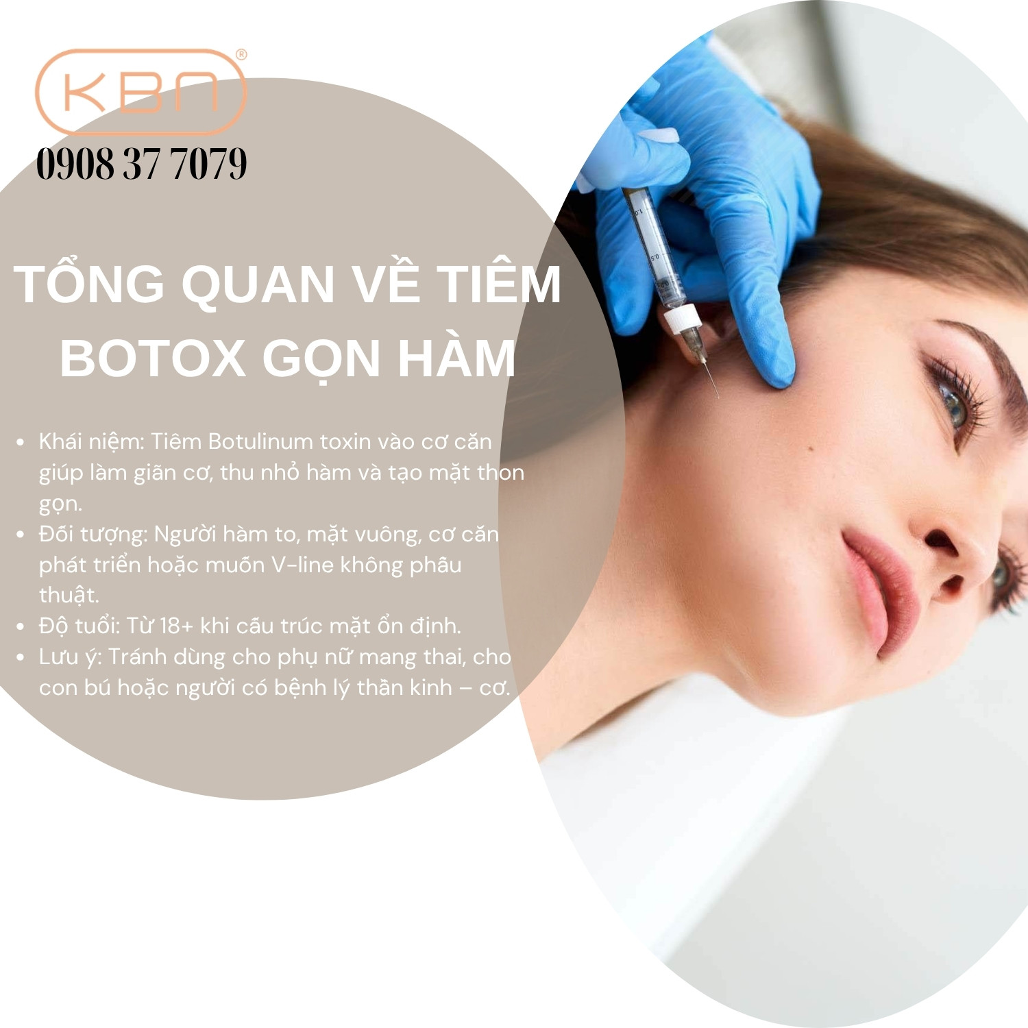 Botox gọn hàm là phương pháp thẩm mỹ không phẫu thuật sử dụng hoạt chất Botulinum toxin để tác động trực tiếp vào cơ cắn – nhóm cơ chính tạo nên độ to và góc cạnh của vùng hàm. Khi được tiêm đúng kỹ thuật, hoạt chất này giúp làm giãn cơ tạm thời, từ đó giảm thể tích cơ theo thời gian và mang lại hiệu ứng khuôn mặt thon gọn, mềm mại hơn. Phương pháp này được ứng dụng rộng rãi trong thẩm mỹ hiện đại nhờ tính nhanh chóng, ít xâm lấn và không cần thời gian nghỉ dưỡng dài, phù hợp với những người muốn cải thiện đường nét khuôn mặt mà không can thiệp dao kéo.