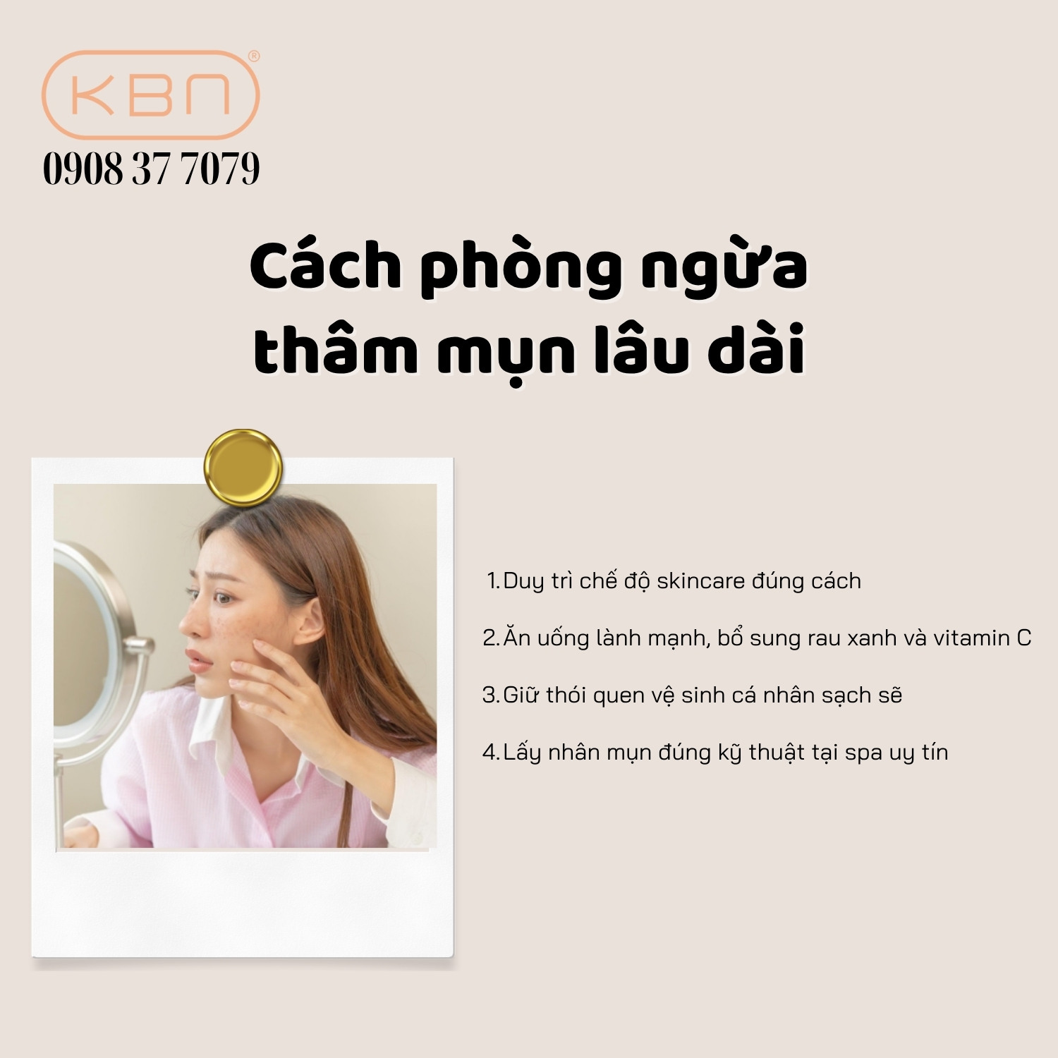 - Lấy nhân mụn đúng kỹ thuật tại spa uy tín: Một trong những nguyên nhân khiến da bị thâm sau mụn là do việc tự nặn mụn sai cách tại nhà. Để hạn chế tình trạng này, nên đến các spa hoặc cơ sở da liễu uy tín để được lấy nhân mụn đúng kỹ thuật, đảm bảo vô khuẩn và không gây tổn thương mô da. Các chuyên viên sẽ sử dụng dụng cụ chuyên dụng và sản phẩm hỗ trợ phục hồi sau lấy nhân, giúp da nhanh lành, hạn chế viêm nhiễm và ngăn ngừa vết thâm xuất hiện.