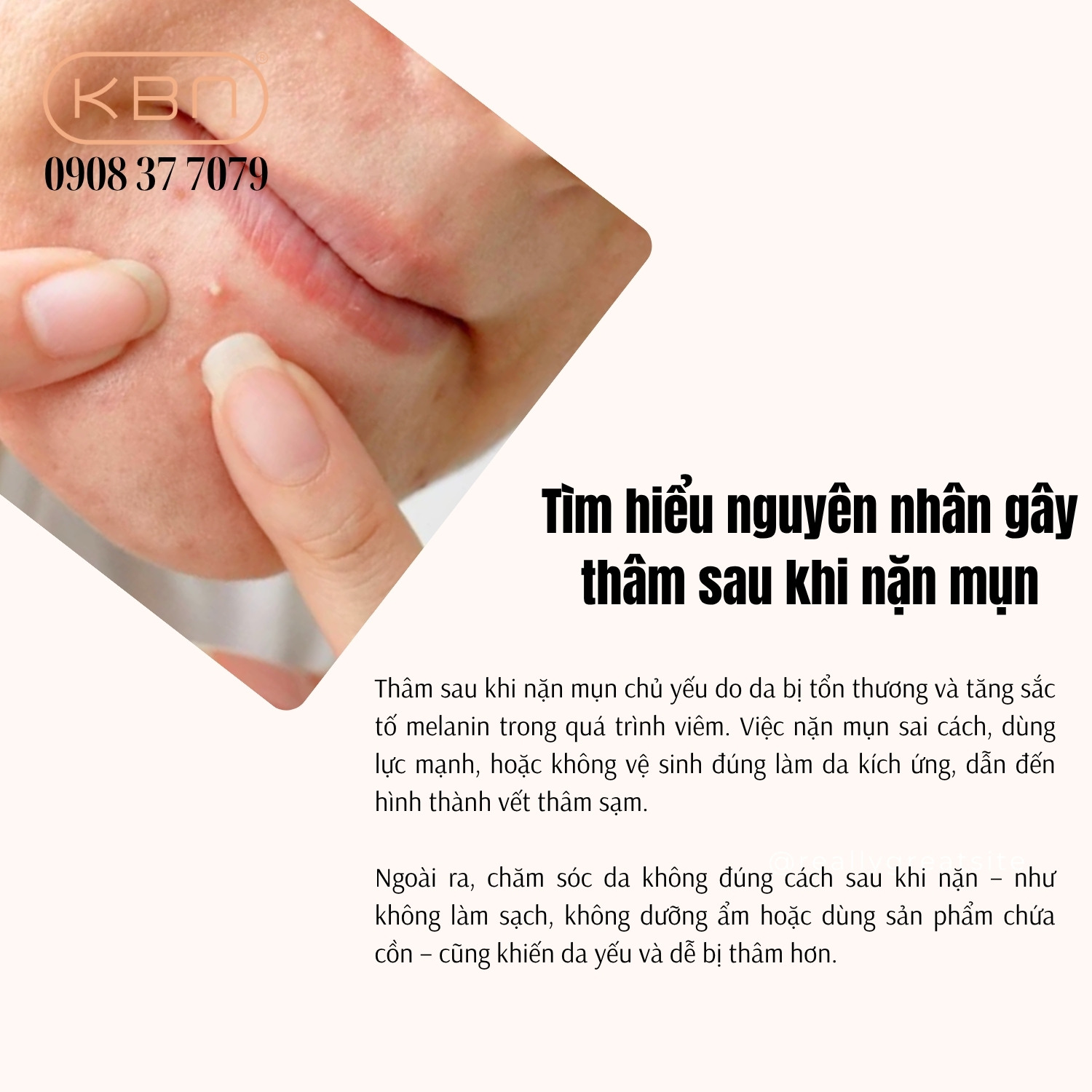 Thâm sau khi nặn mụn là hậu quả thường gặp khi da bị tổn thương và viêm nhiễm trong quá trình lấy nhân mụn. Khi nặn mụn sai cách, dùng lực mạnh hoặc không vệ sinh đúng cách, vùng da quanh mụn sẽ bị kích ứng, khiến sắc tố melanin tăng sinh để bảo vệ da, từ đó hình thành vết thâm sạm. Việc chăm sóc không đúng cách sau khi nặn, như không làm sạch, không dưỡng ẩm hoặc sử dụng sản phẩm chứa cồn, cũng khiến da yếu và dễ bị thâm hơn.