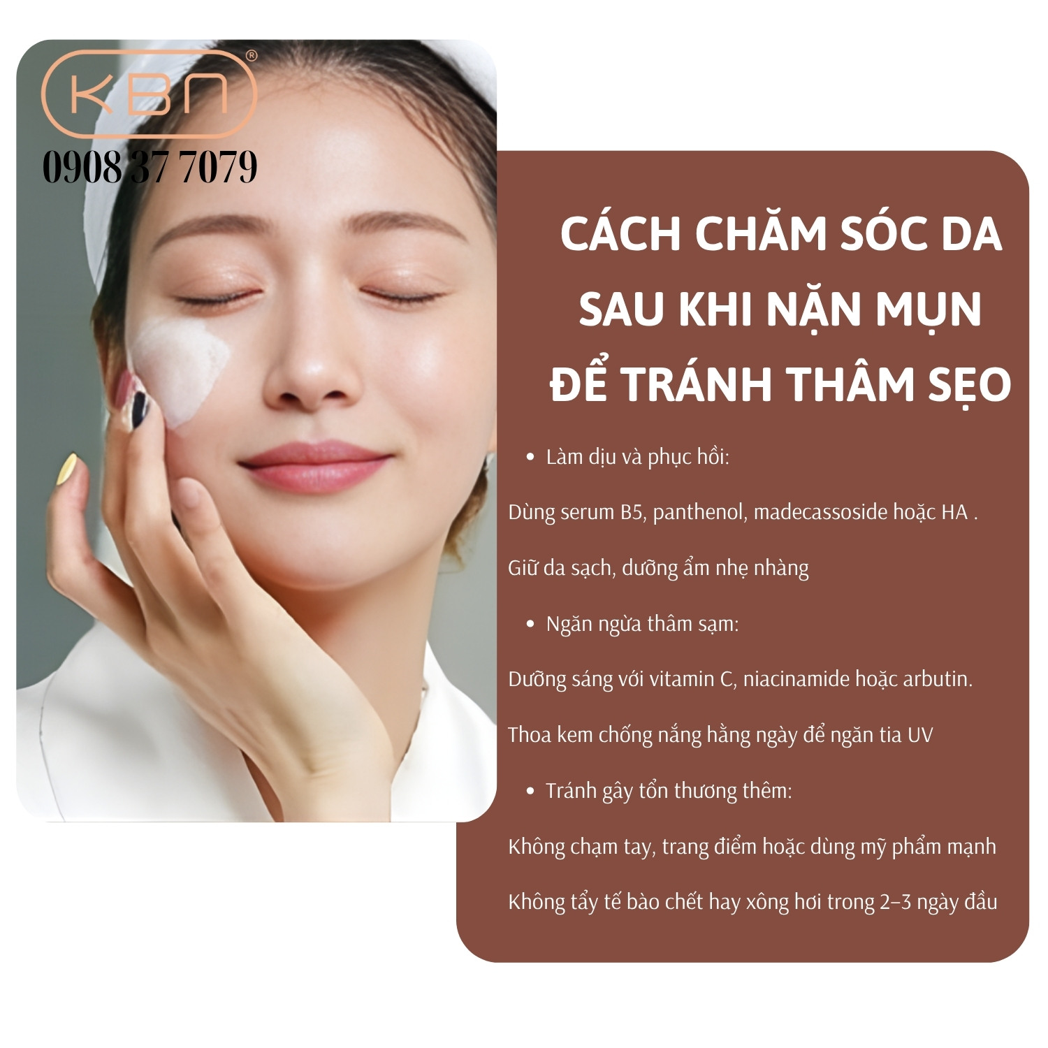 Đây chính là lời giải cho các thắc mắc thường gặp như “nặn mụn xong nên bôi gì để không bị thâm”, “vừa nặn mụn xong nên bôi gì”, hay “nặn mụn xong bôi gì hết thâm”. Khi da đã ổn định, có thể thoa thêm kem phục hồi, serum giảm thâm hoặc sản phẩm chứa vitamin C để ngăn ngừa tăng sắc tố.