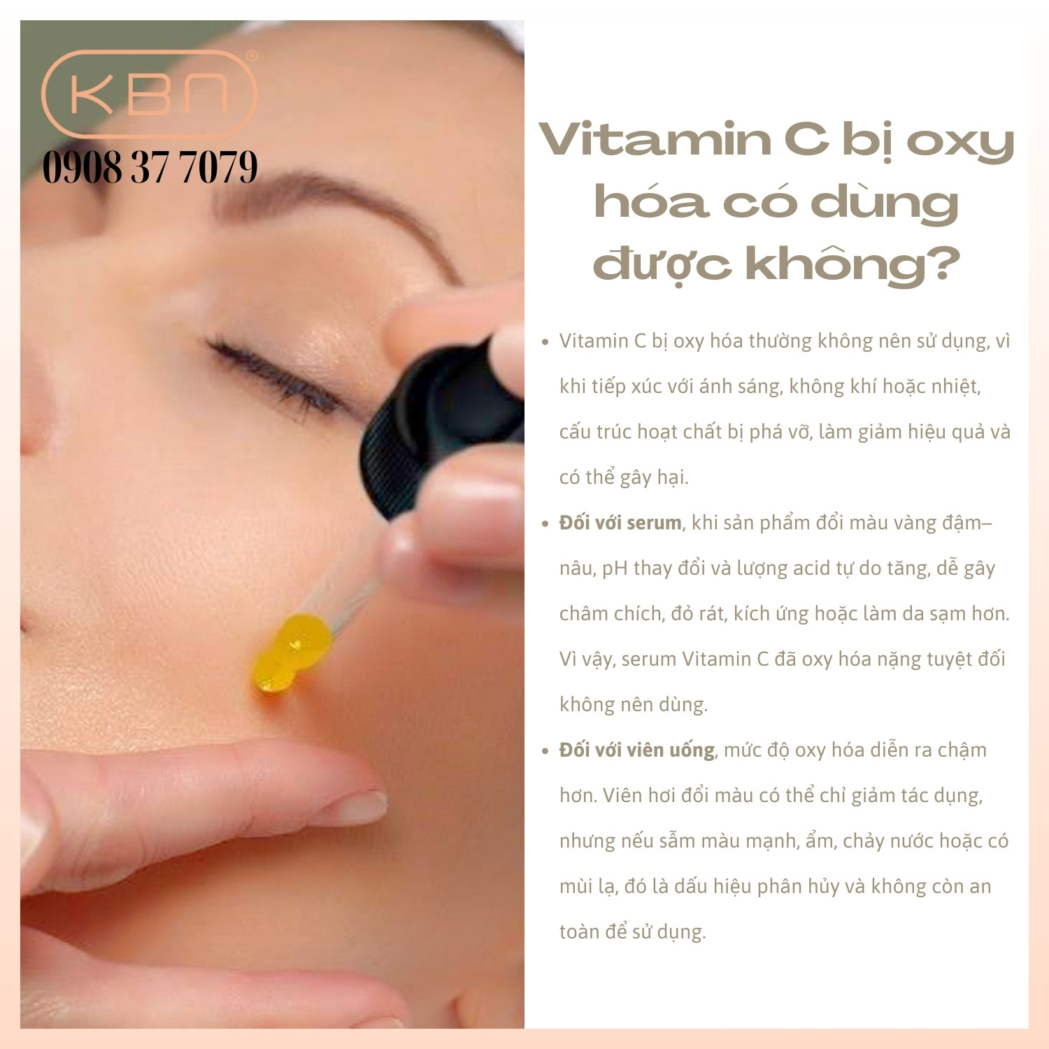 Ở dạng serum, Vitamin C tồn tại trong môi trường nước – rất dễ mất ổn định và chuyển màu từ trong suốt sang vàng, vàng đậm hoặc nâu. Khi đó, sản phẩm không những giảm hiệu quả mà còn trở nên “khó kiểm soát”: độ pH hạ thấp, acid tự do tăng mạnh, tạo nên hỗn hợp dễ gây châm chích, đỏ rát, kích ứng hoặc làm da sạm hơn. Vì vậy, đối với câu hỏi “Vitamin C bị oxy hoá còn dùng được không?”, serum đổi màu nặng được xem là không nên sử dụng bởi nguy cơ kích ứng lớn hơn bất kỳ lợi ích nào còn sót lại.