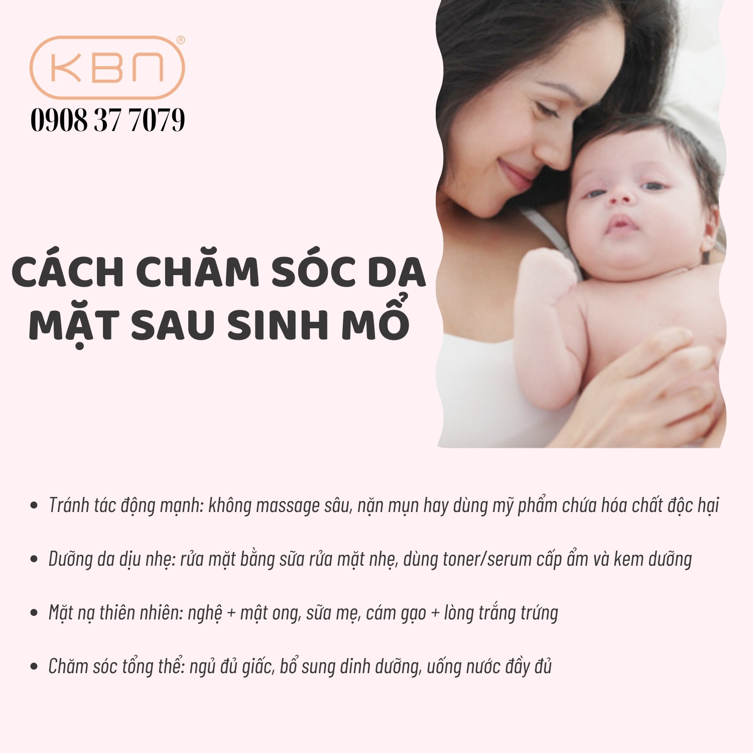 Sau phẫu thuật, cơ thể mẹ bỉm còn trong giai đoạn hồi phục, da và sức đề kháng của cơ thể thường yếu hơn bình thường. Việc chăm sóc da mặt trong thời gian này không chỉ giúp phục hồi vẻ đẹp mà còn hạn chế các vấn đề da thường gặp như mụn, thâm sạm, nám hoặc quầng thâm mắt. Chị em cần tránh các tác động mạnh, massage quá mạnh hoặc sử dụng mỹ phẩm chứa hóa chất độc hại trong thời gian đầu sau sinh.