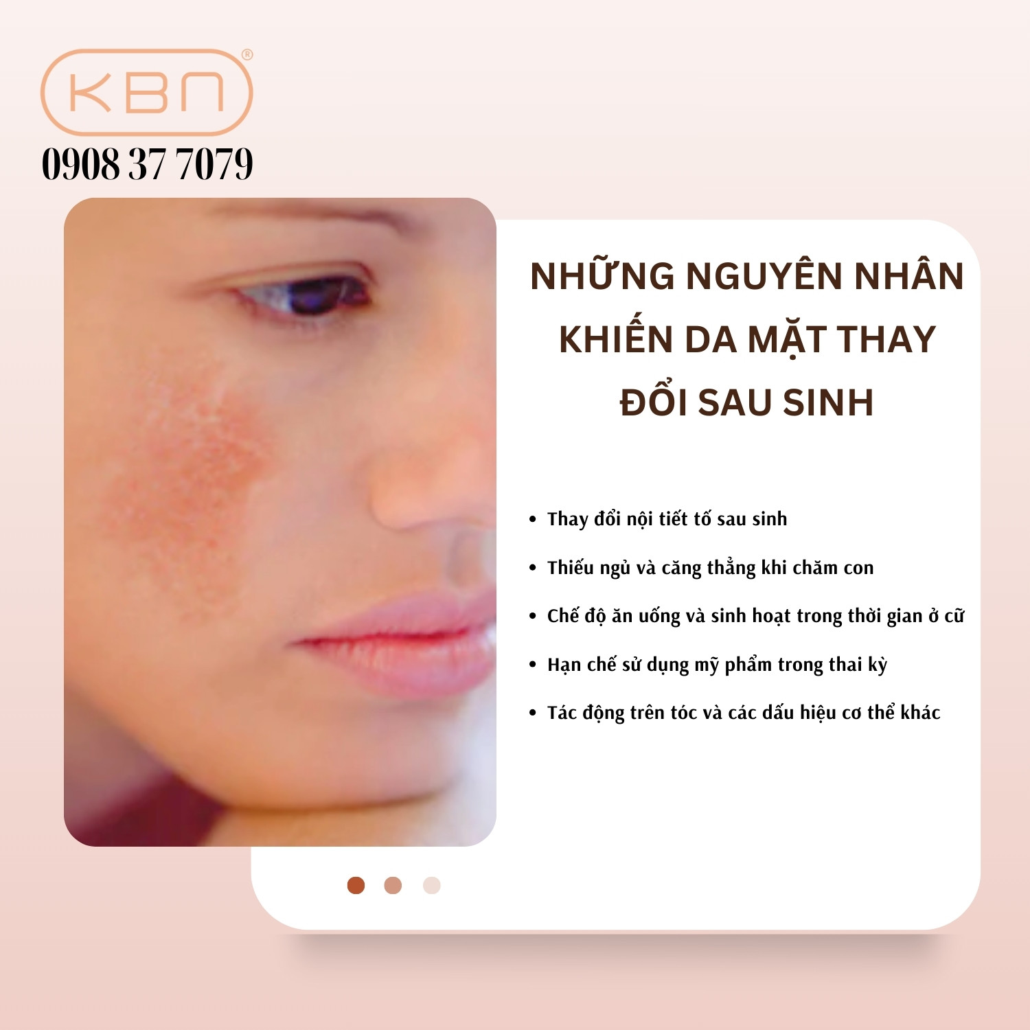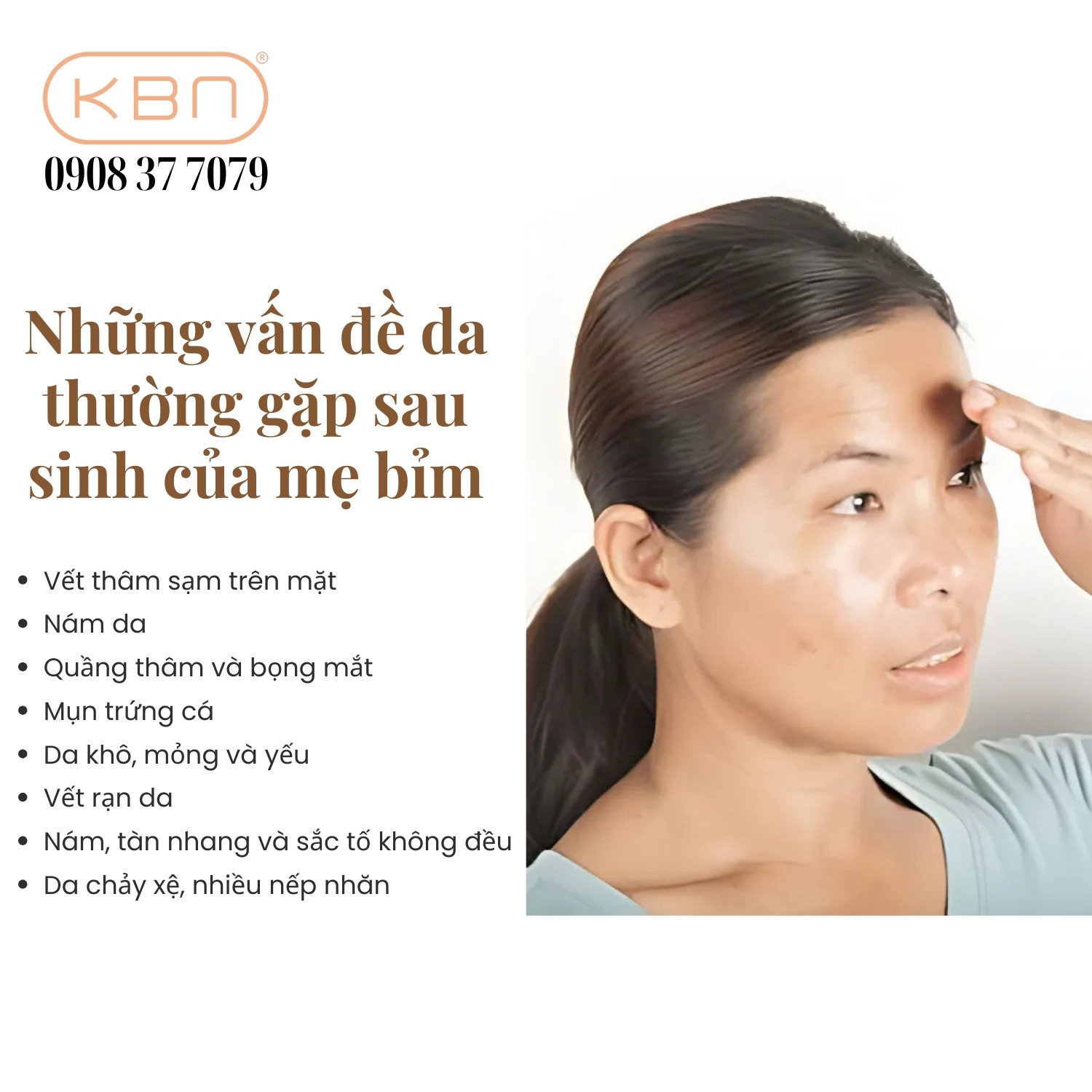 - Nám da: Nám thường xuất hiện ở hai bên má dưới dạng các mảng tăng sắc tố. Nguyên nhân chính là sự thay đổi hormone trong thai kỳ và sau sinh. Nếu được chăm sóc đúng cách, tình trạng nám sau sinh có thể cải thiện đáng kể.
