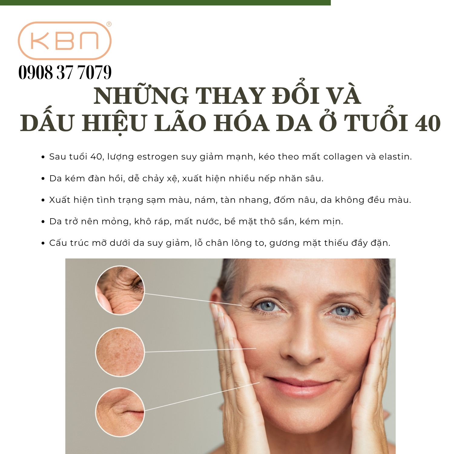 Bên cạnh đó, lão hóa da tuổi 40 còn thể hiện qua sự thay đổi sắc tố: da trở nên sạm màu, xuất hiện nám, tàn nhang, đốm nâu và tình trạng không đều màu. Làn da cũng mỏng hơn, dễ khô ráp và mất nước, khiến bề mặt trở nên thô sần và kém mịn màng. Ngoài ra, cấu trúc mỡ dưới da bị suy giảm, lỗ chân lông giãn to, làm khuôn mặt thiếu sự đầy đặn và trẻ trung như trước.