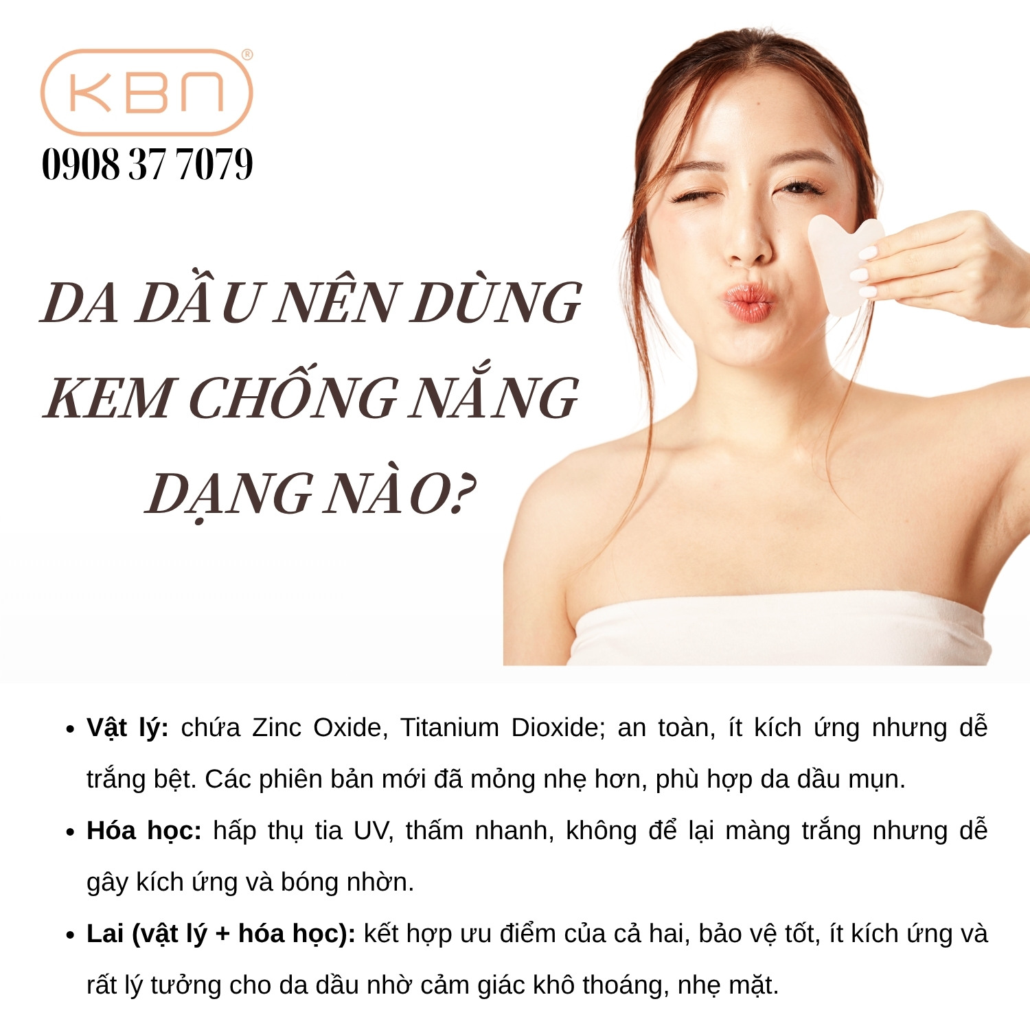 Tóm lại, da dầu nên xài kem chống nắng dạng gel hoặc dạng sữa, ưu tiên loại vật lý lai hóa học với công thức nhẹ, dễ thấm, giúp kiềm dầu hiệu quả và bảo vệ làn da toàn diện.
