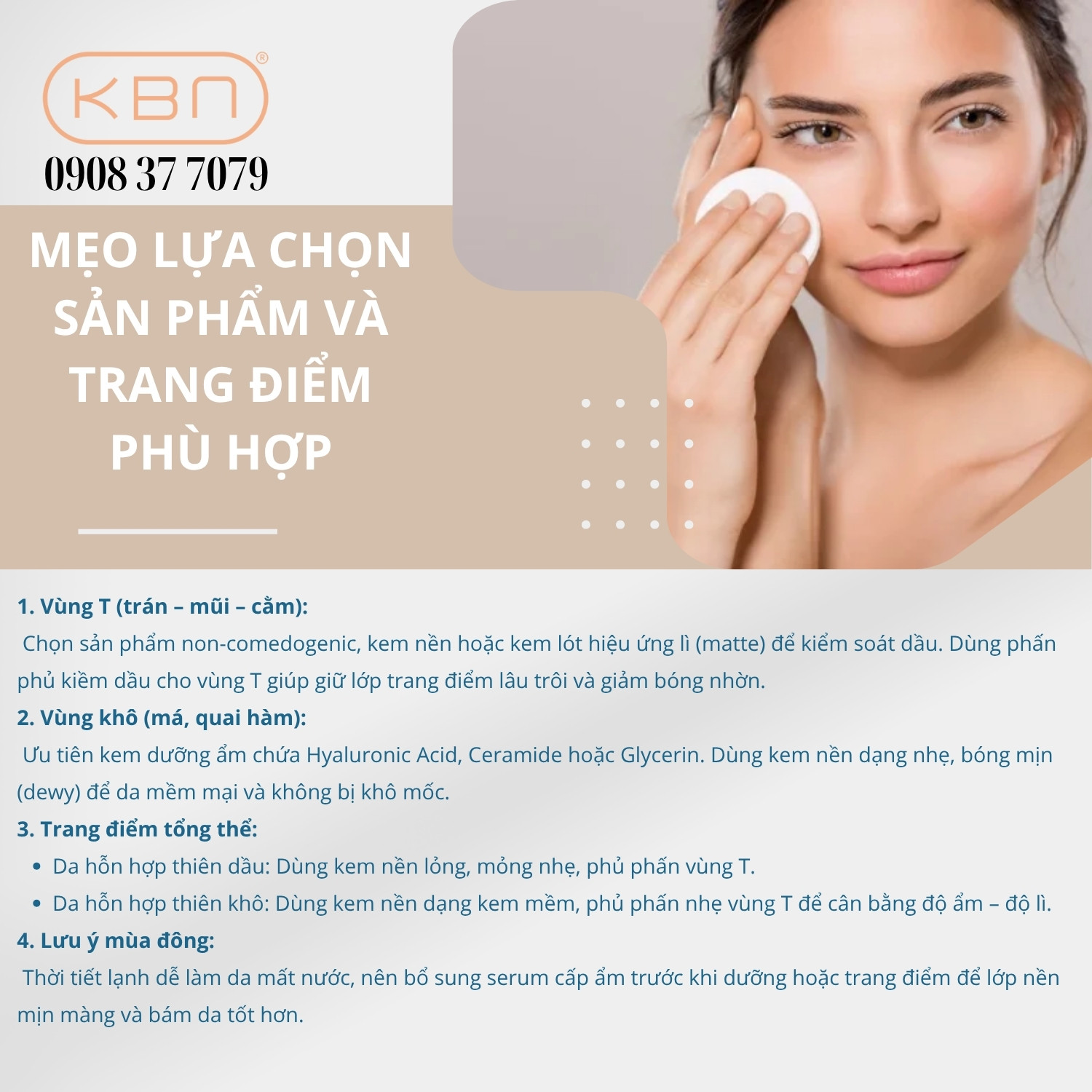 Trang điểm hài hòa cho làn da hỗn hợp: Nếu bạn có da hỗn hợp thiên dầu và da dầu, hãy chọn kem nền dạng lỏng, mỏng nhẹ, sau đó phủ phấn mịn cho vùng T để cố định lớp trang điểm. Ngược lại, với da hỗn hợp thiên khô, nên chọn kem nền dạng kem mềm (cream foundation) giúp tăng độ ẩm, đồng thời phủ phấn nhẹ vùng T để cân bằng giữa độ ẩm và độ lì của lớp nền. Cách kết hợp này không chỉ giúp lớp makeup bền màu mà còn mang lại vẻ tự nhiên, không bị “mốc” hay bóng dầu quá mức.