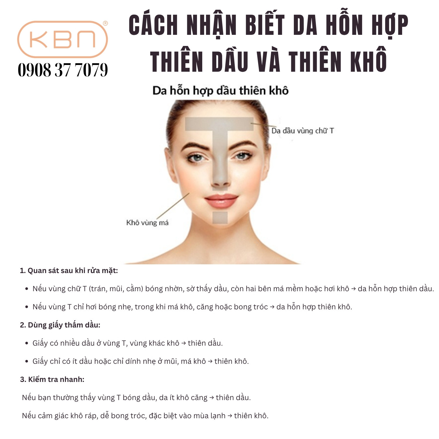 Nếu bạn trả lời “có” cho các câu hỏi về cảm giác khô căng → khả năng cao là da hỗn hợp thiên khô. Ngược lại, nếu bạn thấy vùng T luôn bóng dầu và da ít khi bị căng khô → có thể bạn thuộc nhóm da hỗn hợp thiên dầu.