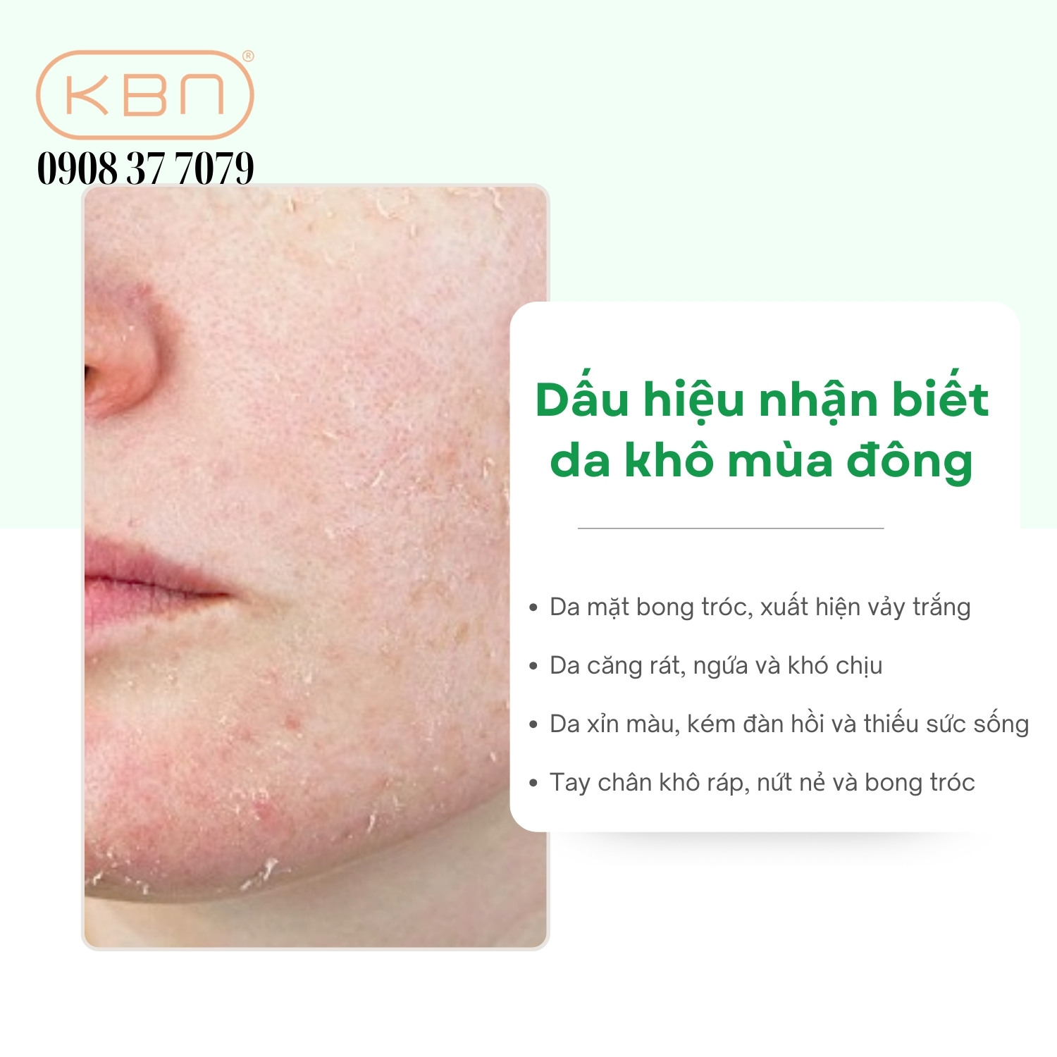 Một trong những dấu hiệu dễ nhận thấy nhất là da mặt bong tróc, sần sùi và xuất hiện các mảng vảy trắng li ti, đặc biệt ở vùng mũi, trán và hai bên má. Tình trạng da bị tróc vảy trắng vào mùa đông cho thấy lớp sừng trên bề mặt da đang bị khô cứng do thiếu nước và dầu tự nhiên.