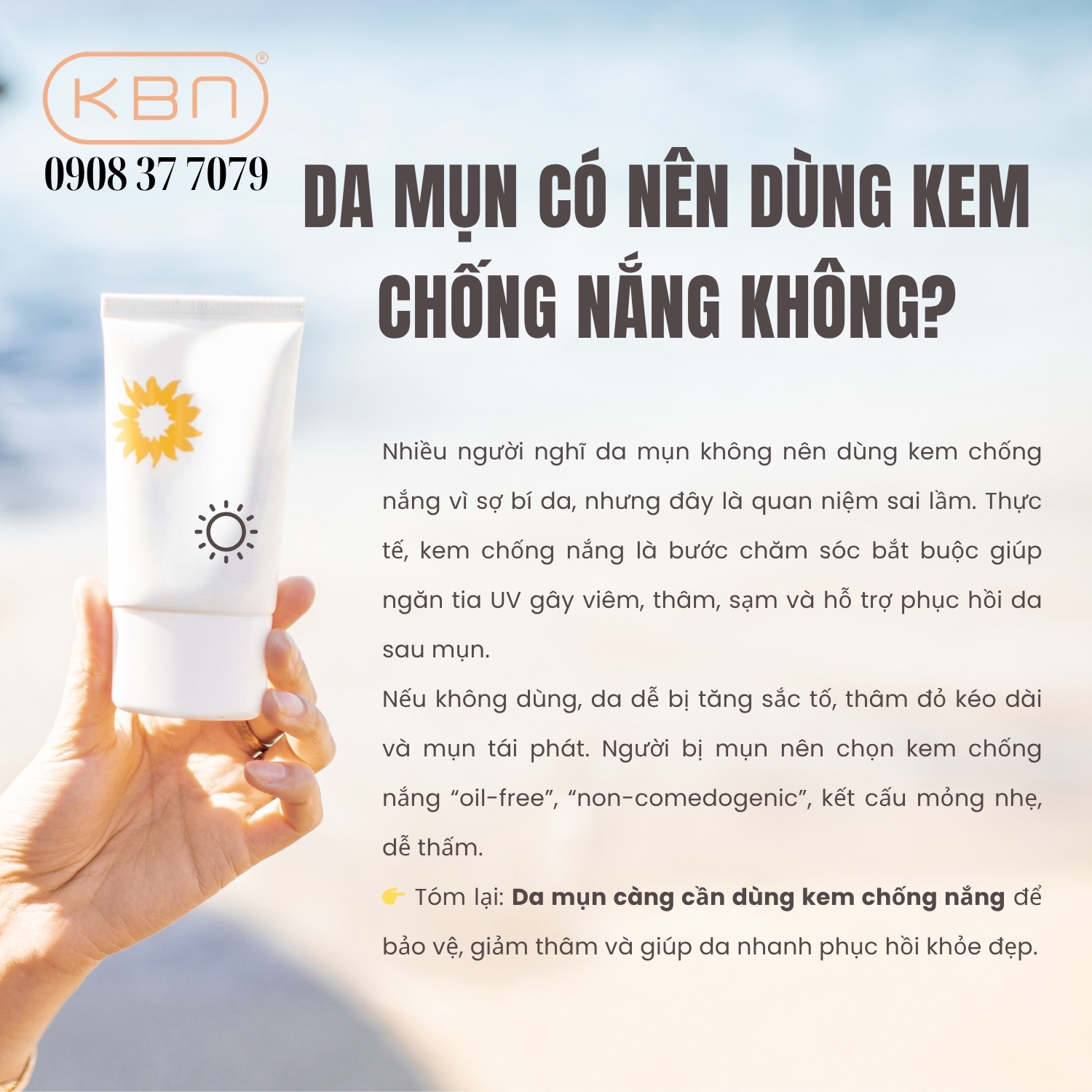 Tóm lại, da mụn hoàn toàn nên dùng kem chống nắng, và thậm chí cần hơn bất kỳ loại da nào khác. Việc sử dụng đúng sản phẩm sẽ giúp da tránh khỏi tác hại của tia UV, hạn chế tình trạng viêm, thâm, sạm và đẩy nhanh quá trình phục hồi sau mụn.