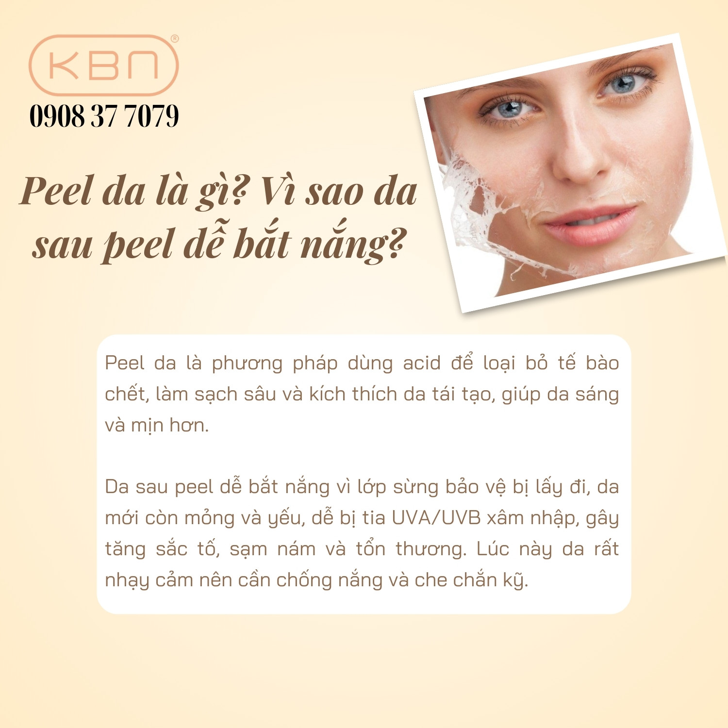 - Chính vì những thay đổi đặc biệt này, da sau peel được xếp vào nhóm da cực kỳ dễ bắt nắng và bắt buộc phải được bảo vệ nghiêm ngặt bằng kem chống nắng kết hợp che chắn vật lý mỗi ngày.