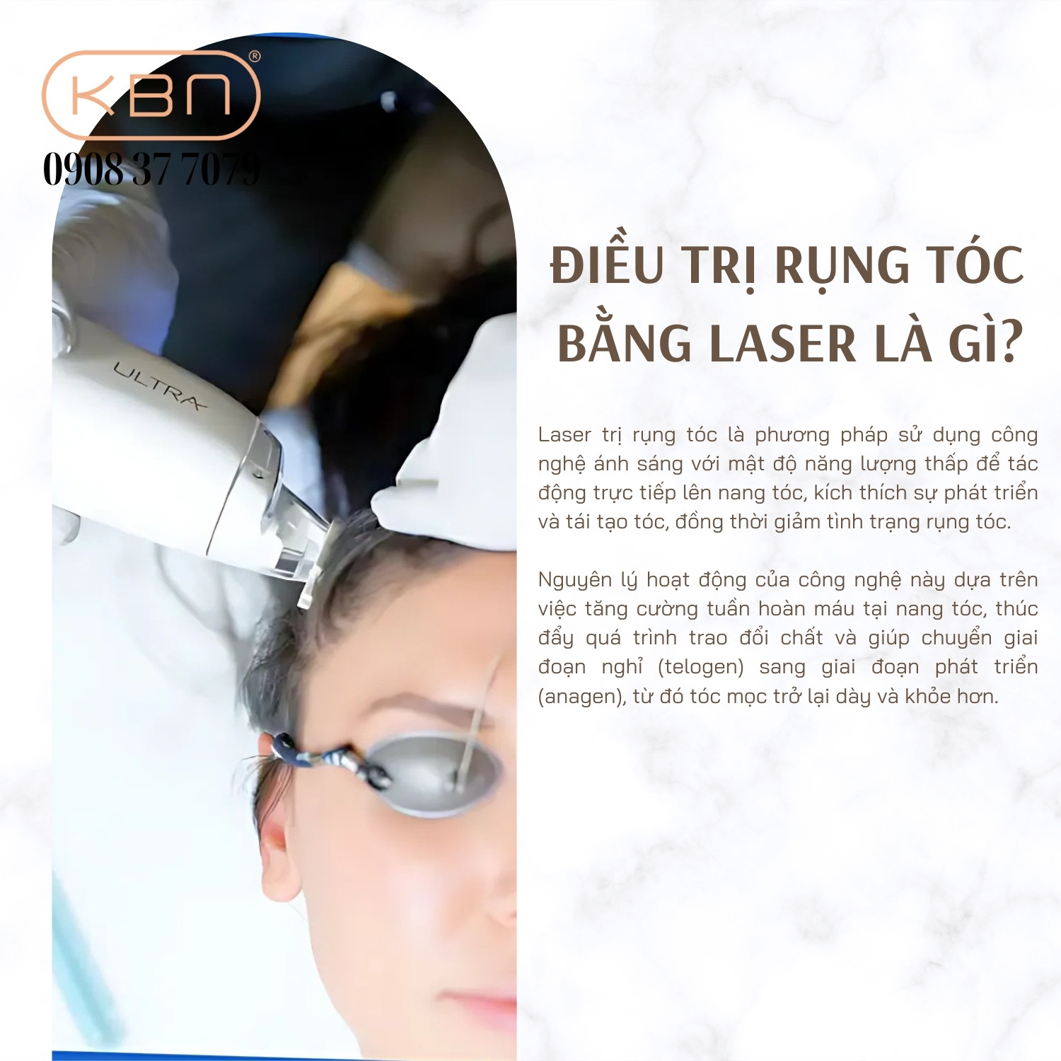 Laser trị rụng tóc là phương pháp sử dụng công nghệ ánh sáng với mật độ năng lượng thấp để tác động trực tiếp lên nang tóc, kích thích sự phát triển và tái tạo tóc, đồng thời giảm tình trạng rụng tóc. Nguyên lý hoạt động của công nghệ này dựa trên việc tăng cường tuần hoàn máu tại nang tóc, thúc đẩy quá trình trao đổi chất và giúp chuyển giai đoạn nghỉ (telogen) sang giai đoạn phát triển (anagen), từ đó tóc mọc trở lại dày và khỏe hơn.