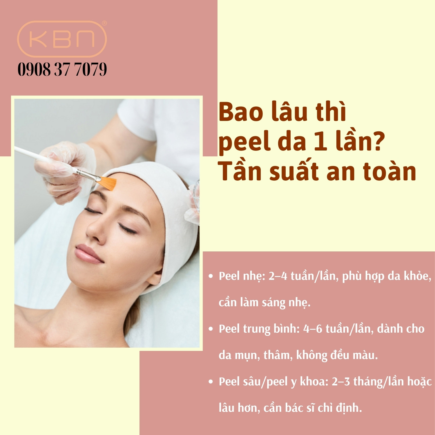 - Đối với peel da nhẹ, thời gian giãn cách phù hợp thường từ 2–4 tuần/lần. Hình thức này tác động chủ yếu lên lớp sừng ngoài cùng của da, phù hợp với da khỏe hoặc da cần làm sáng và làm mới nhẹ nhàng, nên thời gian hồi phục tương đối nhanh.