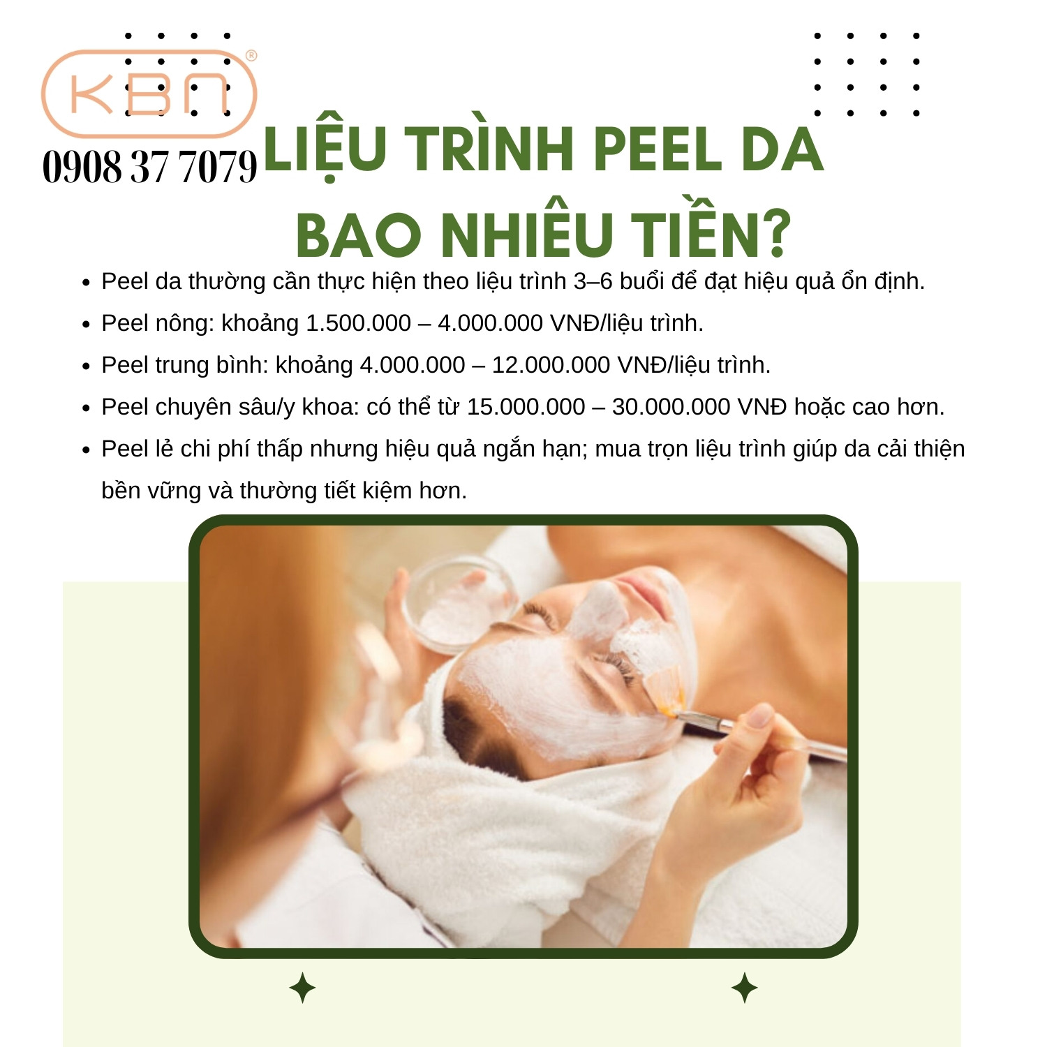 Về chi phí, liệu trình peel da bao nhiêu tiền sẽ phụ thuộc vào loại peel được chỉ định và số buổi cần thực hiện. Với peel nông, tổng chi phí cho một liệu trình thường ở mức 1.500.000 – 4.000.000 VNĐ. Đối với peel trung bình, chi phí có thể dao động từ 4.000.000 – 12.000.000 VNĐ, trong khi peel chuyên sâu hoặc peel y khoa có thể lên đến 15.000.000 – 30.000.000 VNĐ hoặc cao hơn, do yêu cầu kỹ thuật cao và quy trình theo dõi chặt chẽ. Những con số này chỉ mang tính tham khảo và có thể thay đổi tùy từng cơ sở.