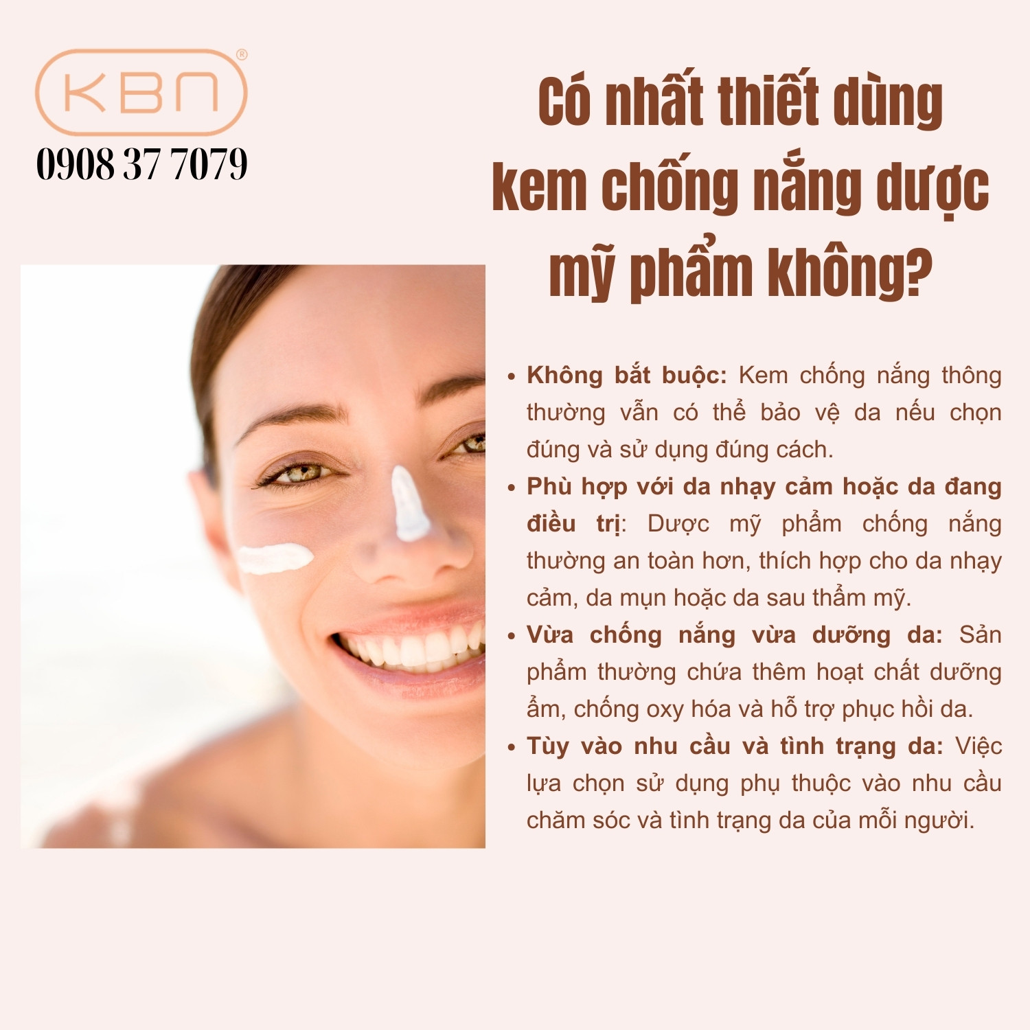 Trên thực tế, việc sử dụng kem chống nắng là bước quan trọng trong quy trình chăm sóc da hằng ngày, tuy nhiên không bắt buộc phải luôn sử dụng dòng dược mỹ phẩm. Nhiều loại kem chống nắng thông thường vẫn có khả năng bảo vệ da khỏi tác hại của tia UVA và UVB nếu được lựa chọn đúng và sử dụng đúng cách. Tuy vậy, kem chống nắng dược mỹ phẩm thường được đánh giá cao hơn nhờ bảng thành phần được nghiên cứu kỹ lưỡng và phù hợp với nhiều tình trạng da khác nhau.