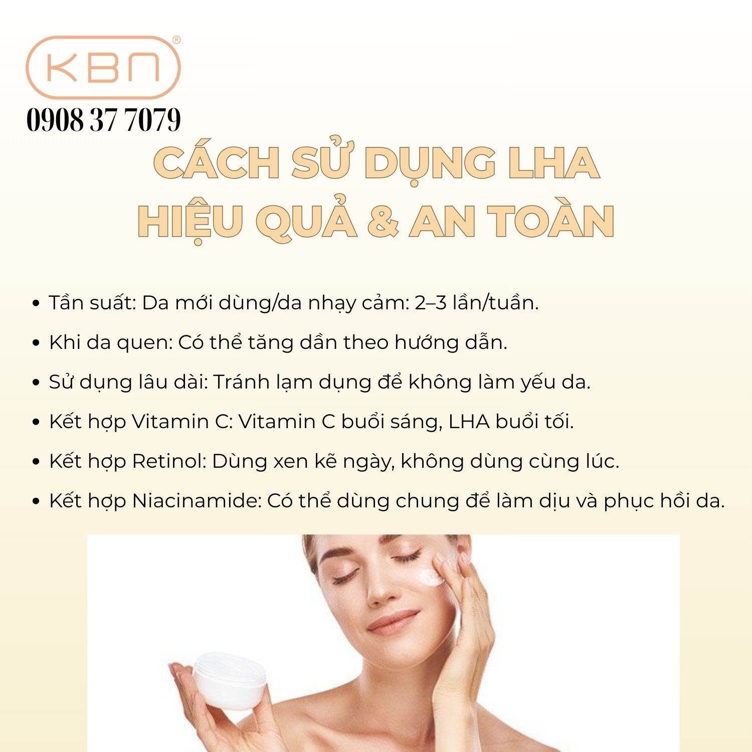 Tần suất sử dụng LHA phụ thuộc vào tình trạng da và nồng độ hoạt chất trong sản phẩm. Với làn da mới bắt đầu hoặc da nhạy cảm, nên sử dụng mỹ phẩm chứa LHA từ 2–3 lần mỗi tuần để da có thời gian thích nghi. Khi làn da đã quen, có thể tăng dần tần suất theo hướng dẫn của nhà sản xuất hoặc tư vấn từ chuyên gia chăm sóc da.