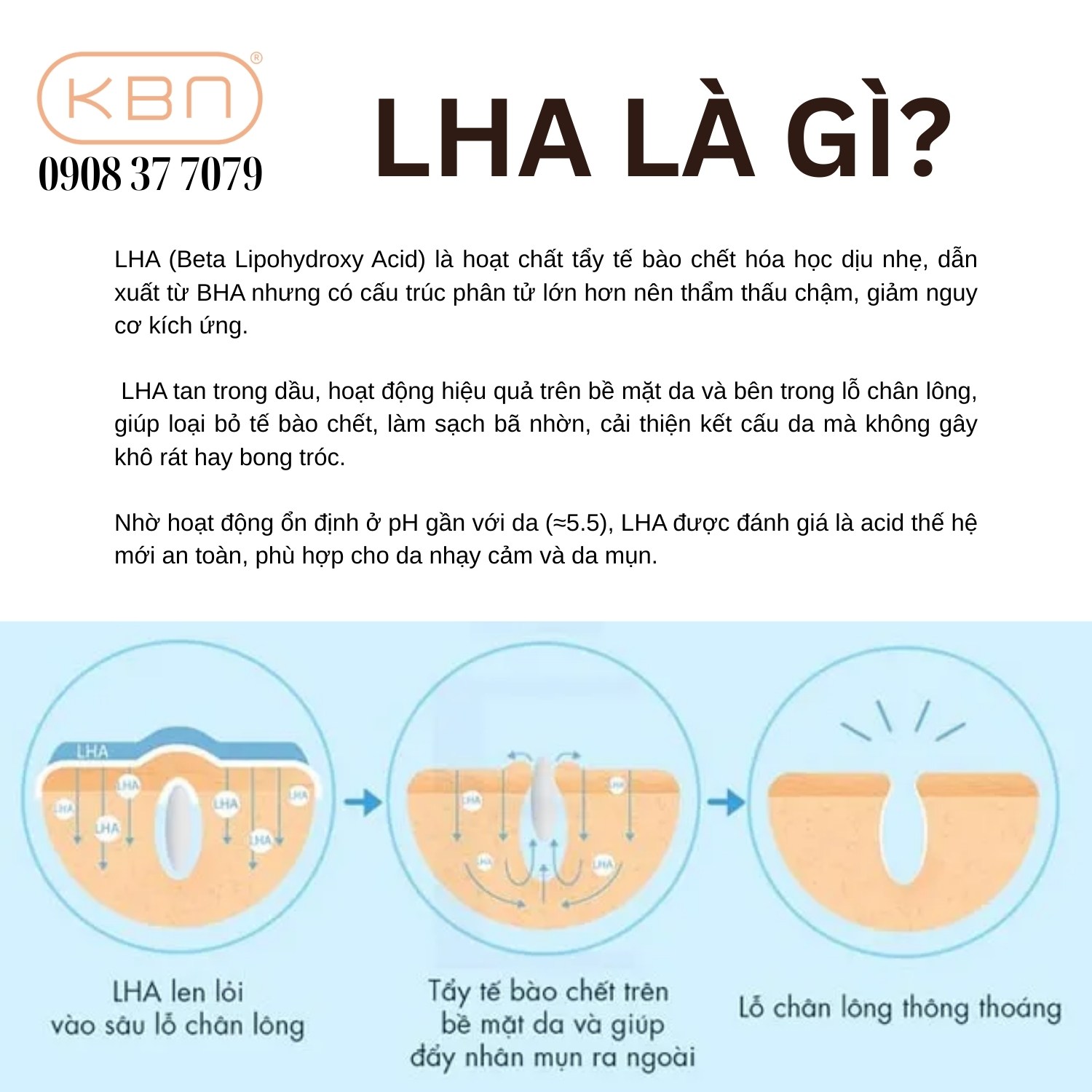 LHA (Beta Lipohydroxy Acid) là một hoạt chất tẩy tế bào chết hóa học dịu nhẹ, thường được sử dụng trong các sản phẩm chăm sóc da hiện đại. Đây là dẫn xuất của BHA (Salicylic Acid) nhưng có cấu trúc phân tử lớn hơn, giúp kiểm soát tốc độ thẩm thấu và giảm nguy cơ kích ứng trên da. Nhờ đặc tính này, LHA được đánh giá là lựa chọn an toàn cho làn da nhạy cảm và da mụn.