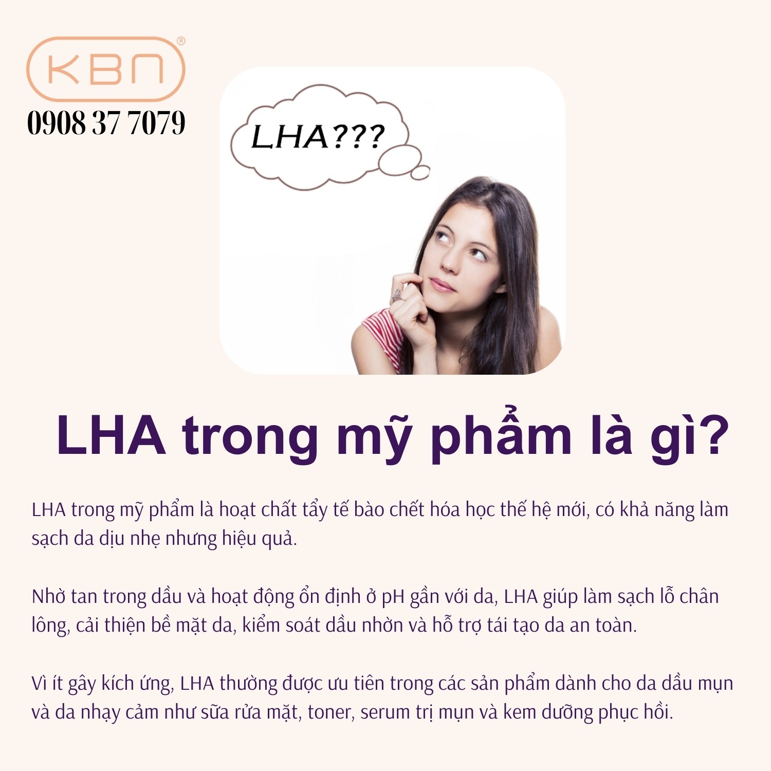 LHA trong mỹ phẩm là một hoạt chất tẩy tế bào chết hóa học thế hệ mới, được đưa vào công thức sản phẩm nhằm hỗ trợ làm sạch da một cách nhẹ nhàng nhưng hiệu quả. Nhờ đặc tính tan trong dầu và khả năng hoạt động ổn định ở độ pH gần với sinh lý tự nhiên của da, LHA giúp cải thiện bề mặt da, hạn chế bít tắc lỗ chân lông và duy trì trạng thái da khỏe mạnh trong quá trình chăm sóc hàng ngày.