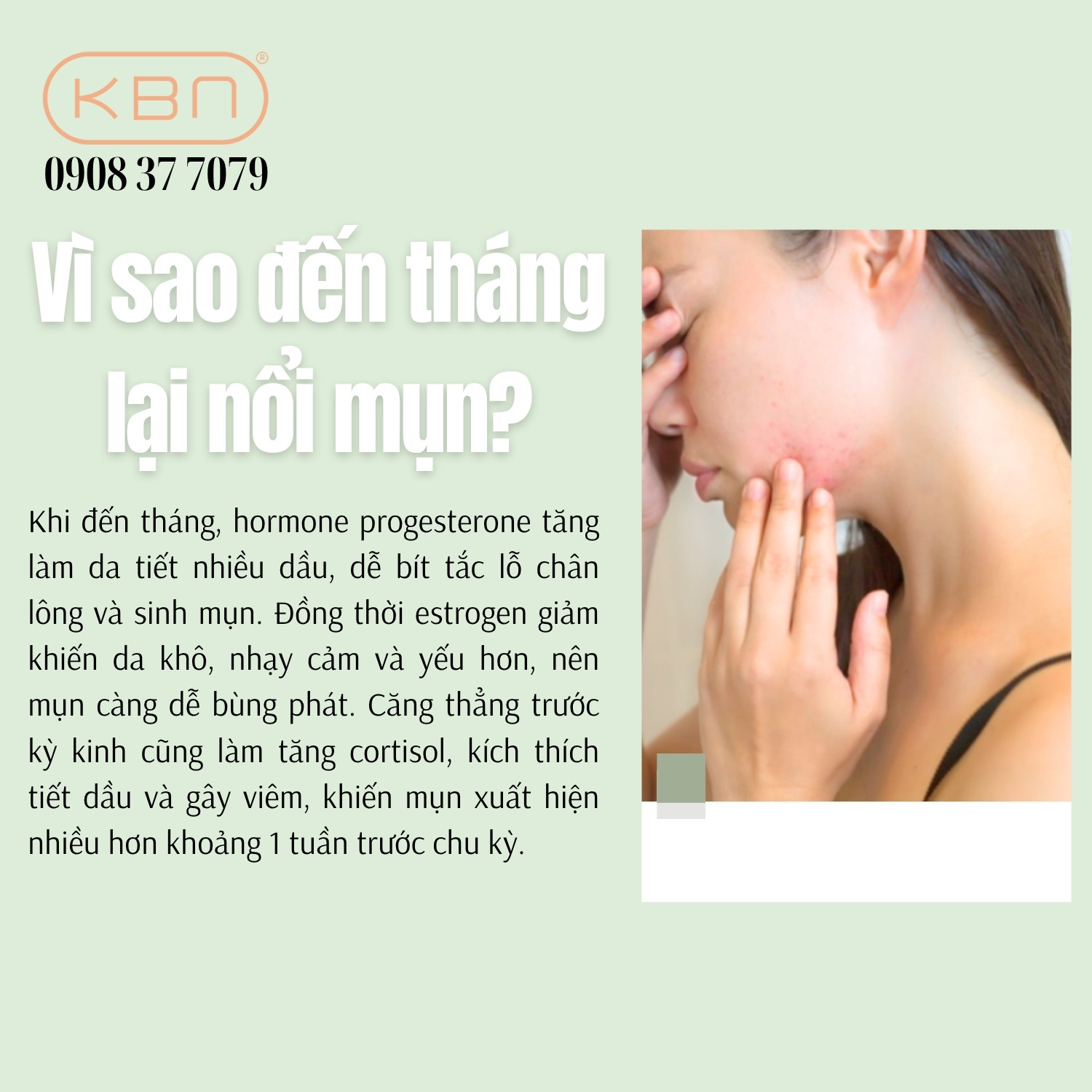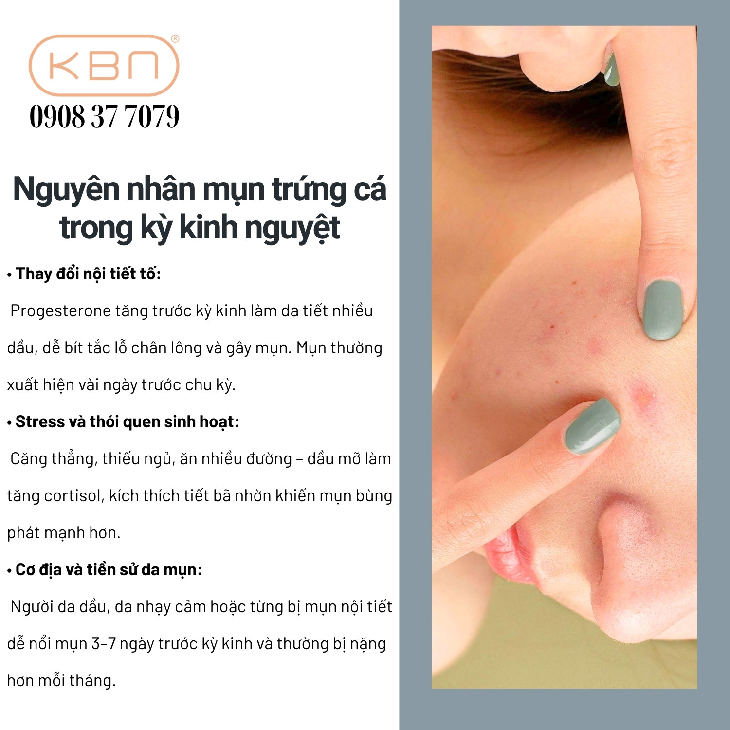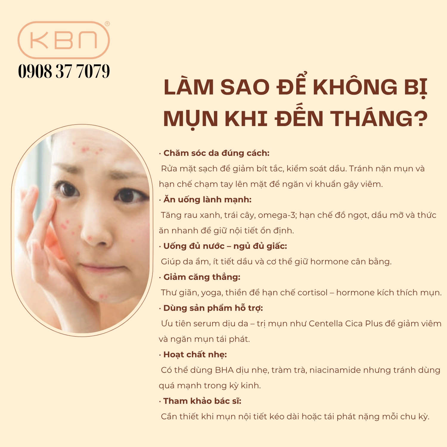 Hana KBN tự hào là địa chỉ cung cấp mỹ phẩm Hàn Quốc chính hãng, đồng hành cùng bạn trong việc chăm sóc và phục hồi làn da, đặc biệt là làn da dễ nổi mụn nội tiết. Đừng để mụn làm bạn mất tự tin, hãy chăm sóc da đúng cách và sử dụng sản phẩm phù hợp để duy trì vẻ đẹp tự nhiên mỗi ngày. Liên hệ ngay 0908 37 7079 để được tư vấn và lựa chọn giải pháp chăm sóc da hiệu quả, an toàn từ Hana KBN.