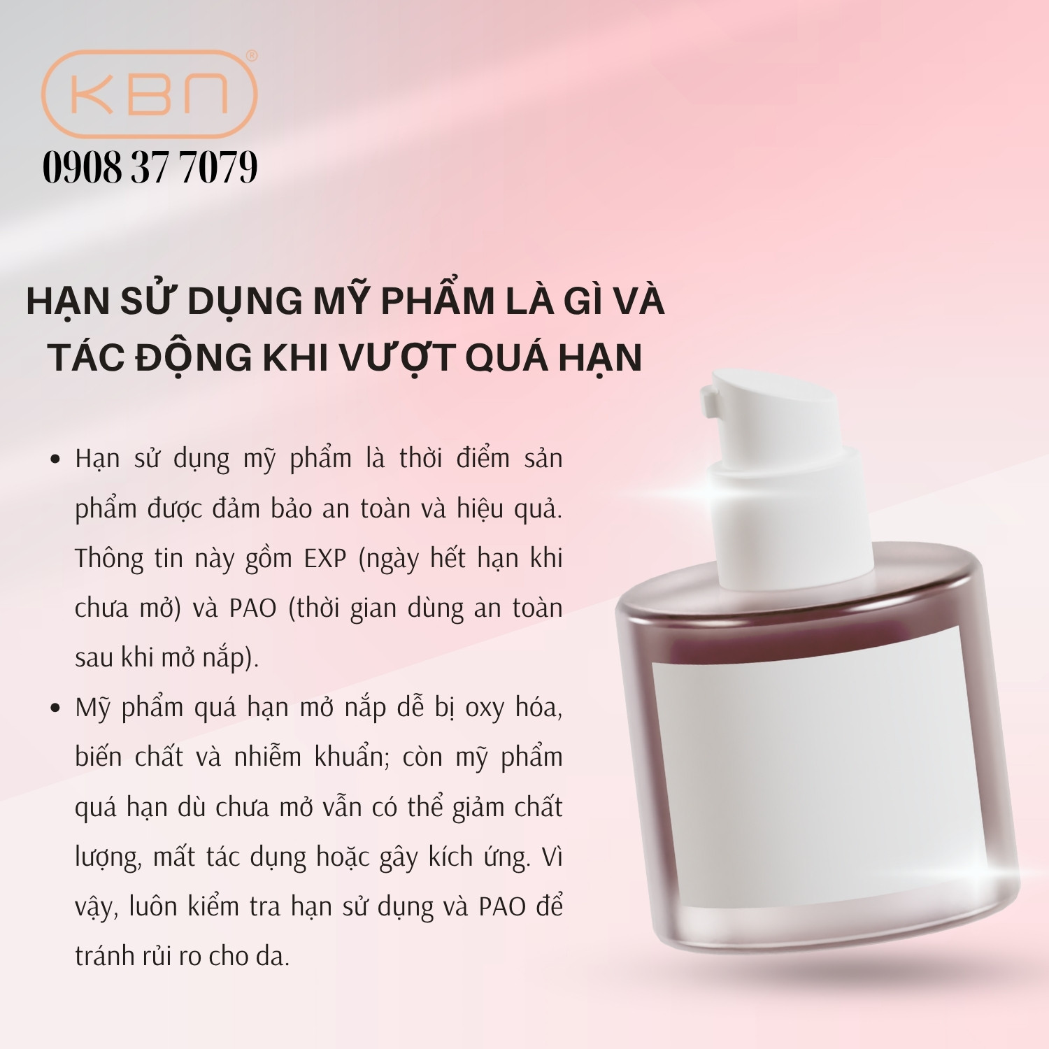 Hạn sử dụng của mỹ phẩm là mốc thời gian mà nhà sản xuất cam kết về chất lượng, hiệu quả và độ an toàn của sản phẩm khi sử dụng. Trong khoảng thời gian này, các thành phần trong mỹ phẩm vẫn giữ được sự ổn định, đảm bảo không gây hại cho làn da và phát huy tối đa tác dụng. Tuân thủ hạn sử dụng giúp bạn tránh được các rủi ro tiềm ẩn do mỹ phẩm biến chất, đặc biệt với những sản phẩm chứa các hoạt chất nhạy cảm như vitamin, peptide hay chiết xuất từ thiên nhiên.