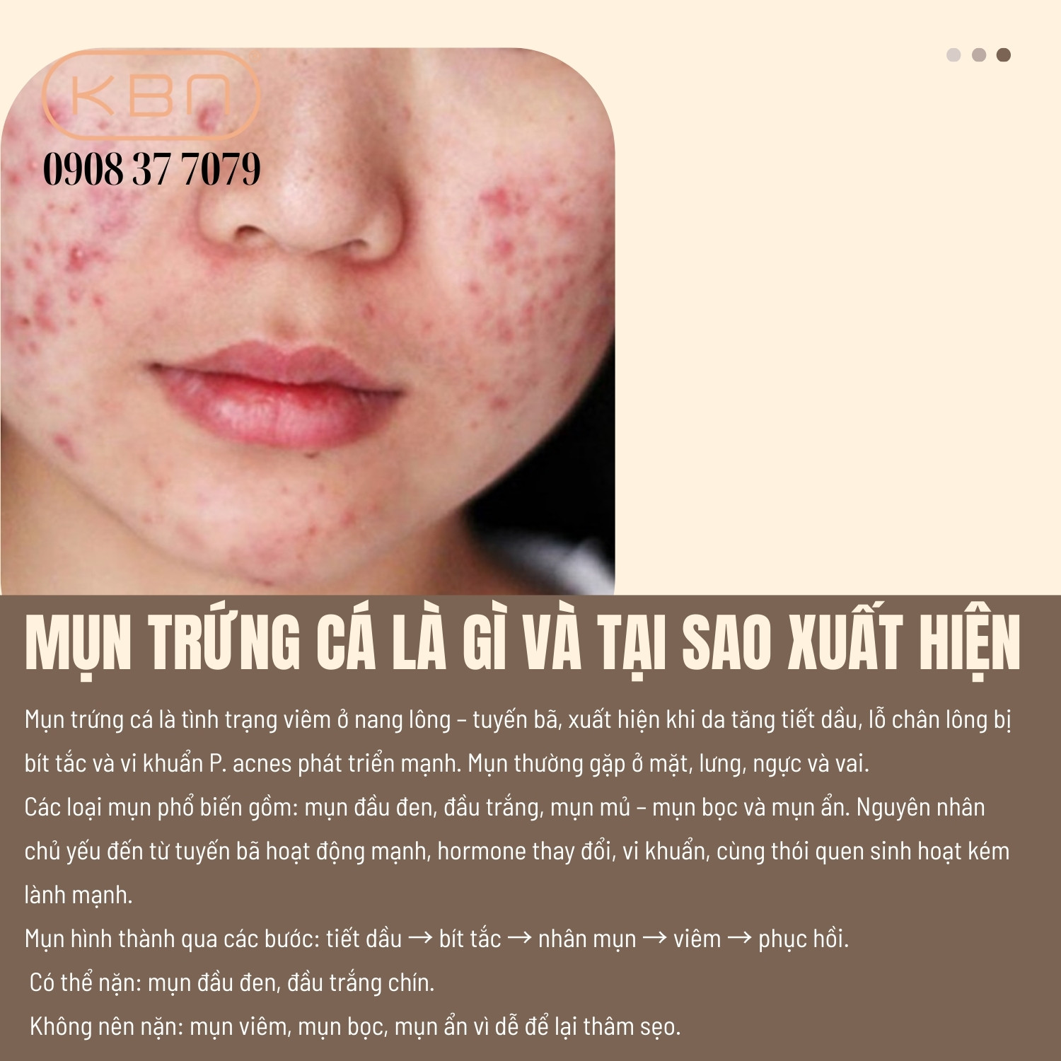 Mụn trứng cá là tình trạng viêm khu trú tại nang lông – tuyến bã, thường xuất hiện ở những vùng da tiết nhiều dầu như mặt, lưng, ngực và vai. Nguyên nhân chính dẫn đến mụn trứng cá là sự kết hợp giữa việc da tăng tiết bã nhờn, hiện tượng sừng hóa nang lông và sự phát triển quá mức của vi khuẩn trên da. Khi các yếu tố này kết hợp, chúng tạo điều kiện cho mụn hình thành và gây ra các tổn thương viêm đỏ trên bề mặt da.
