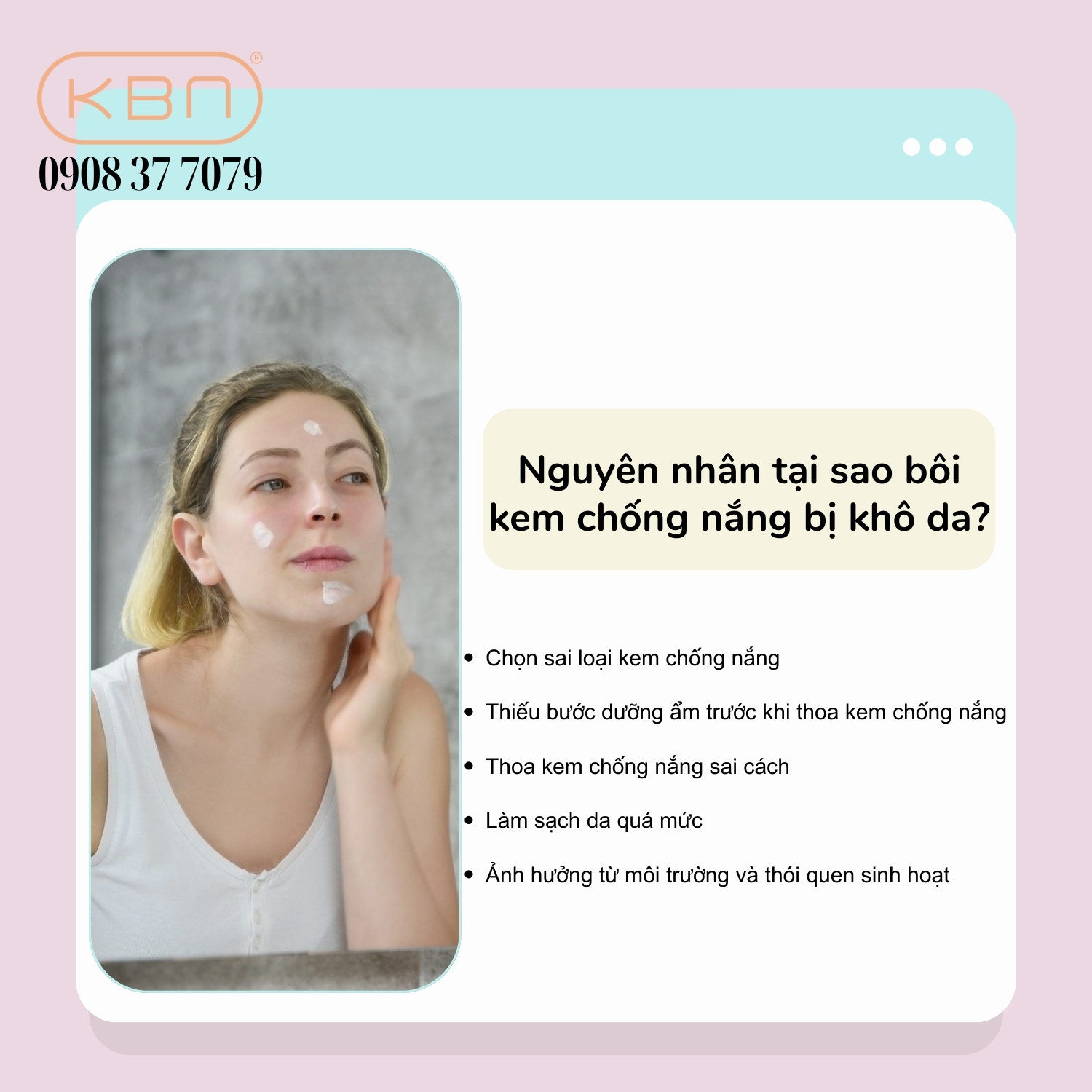 Cách sử dụng kem chống nắng không đúng cũng khiến da dễ bị khô. Thoa quá ít làm giảm hiệu quả bảo vệ, trong khi thoa quá nhiều lại gây bí da và khô bề mặt. Nếu kem không được tán đều, da sẽ dễ bị khô từng vùng, nhất là ở hai bên mũi và khóe miệng. Bôi kem khi da chưa được dưỡng ẩm kỹ cũng khiến da khó hấp thụ và nhanh mất nước.