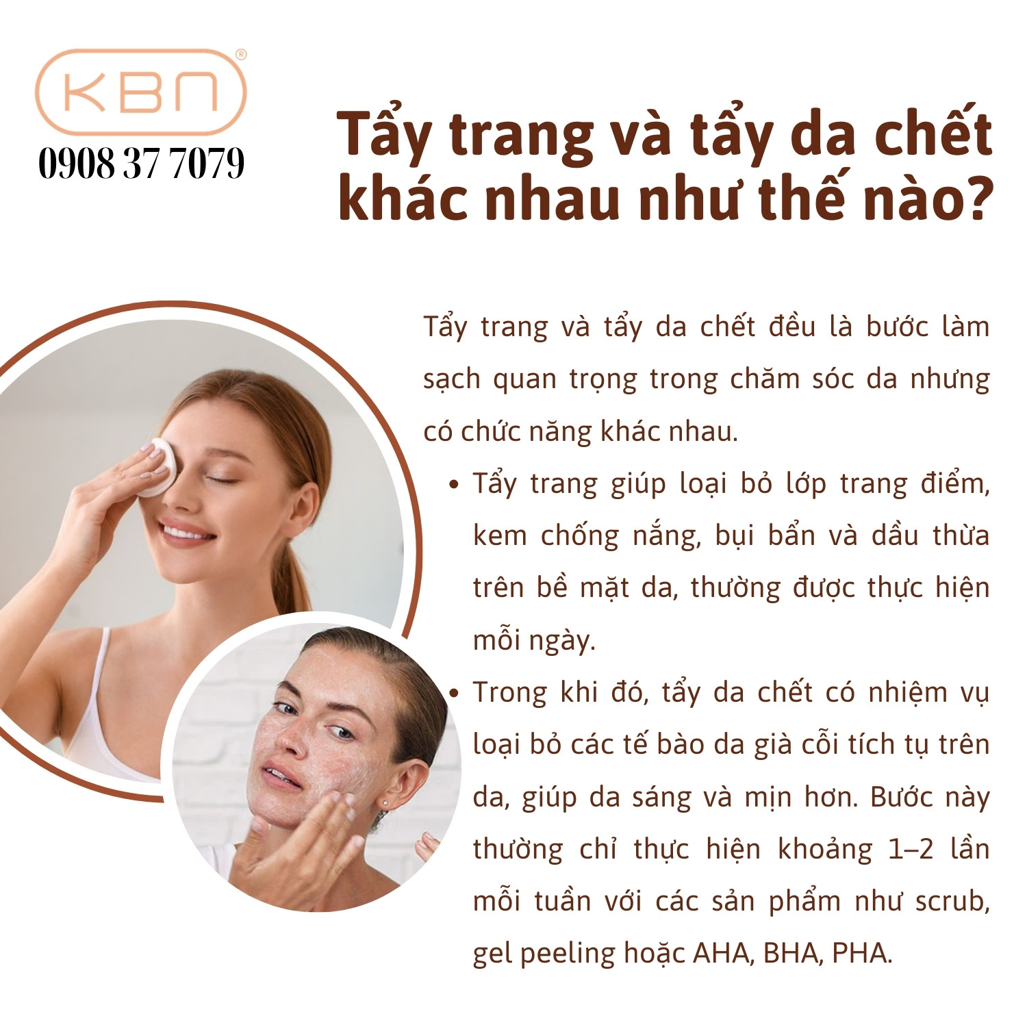 Thực tế, tẩy trang và tẩy da chết có mục đích và cơ chế hoạt động hoàn toàn khác nhau. Nếu tẩy trang giúp loại bỏ lớp trang điểm, kem chống nắng, bụi bẩn và dầu thừa trên bề mặt da thì tẩy da chết lại tập trung vào việc loại bỏ lớp tế bào già cỗi tích tụ trên da theo chu kỳ tái tạo tự nhiên. Vì vậy, khi tìm hiểu tẩy trang và tẩy da chết khác nhau như thế nào, cần xem xét nhiều yếu tố như mục đích sử dụng, tần suất thực hiện, loại sản phẩm và tác dụng đối với làn da.