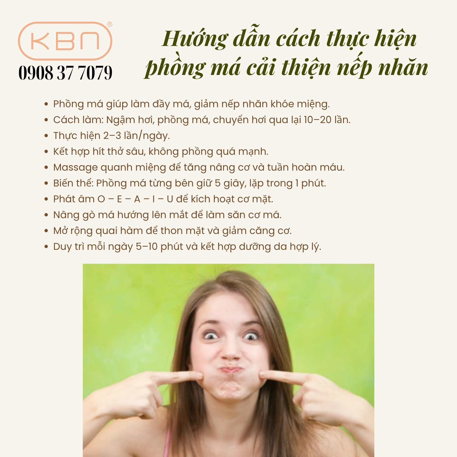 Bài tập phồng má là một phương pháp đơn giản nhưng hiệu quả giúp cải thiện nếp nhăn, đặc biệt là vùng má và khóe miệng. Khi khuôn mặt bắt đầu xuất hiện các dấu hiệu lão hóa như má hóp, da chảy xệ hay nếp nhăn, việc thực hiện các động tác phồng má đều đặn có thể làm đầy vùng má, nâng cơ nhẹ nhàng và tạo sự cân đối cho đường nét khuôn mặt. Đây là phương pháp có thể thực hiện tại nhà, không cần đến các thiết bị chuyên dụng hay liệu trình thẩm mỹ phức tạp.