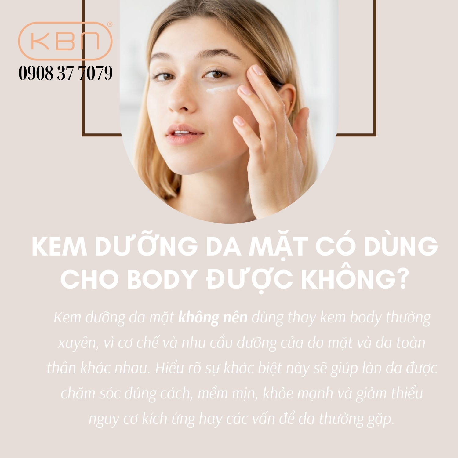 Kem dưỡng da mặt không nên dùng thay kem body thường xuyên, vì cơ chế và nhu cầu dưỡng của da mặt và da toàn thân khác nhau. Hiểu rõ sự khác biệt này sẽ giúp làn da được chăm sóc đúng cách, mềm mịn, khỏe mạnh và giảm thiểu nguy cơ kích ứng hay các vấn đề da thường gặp.