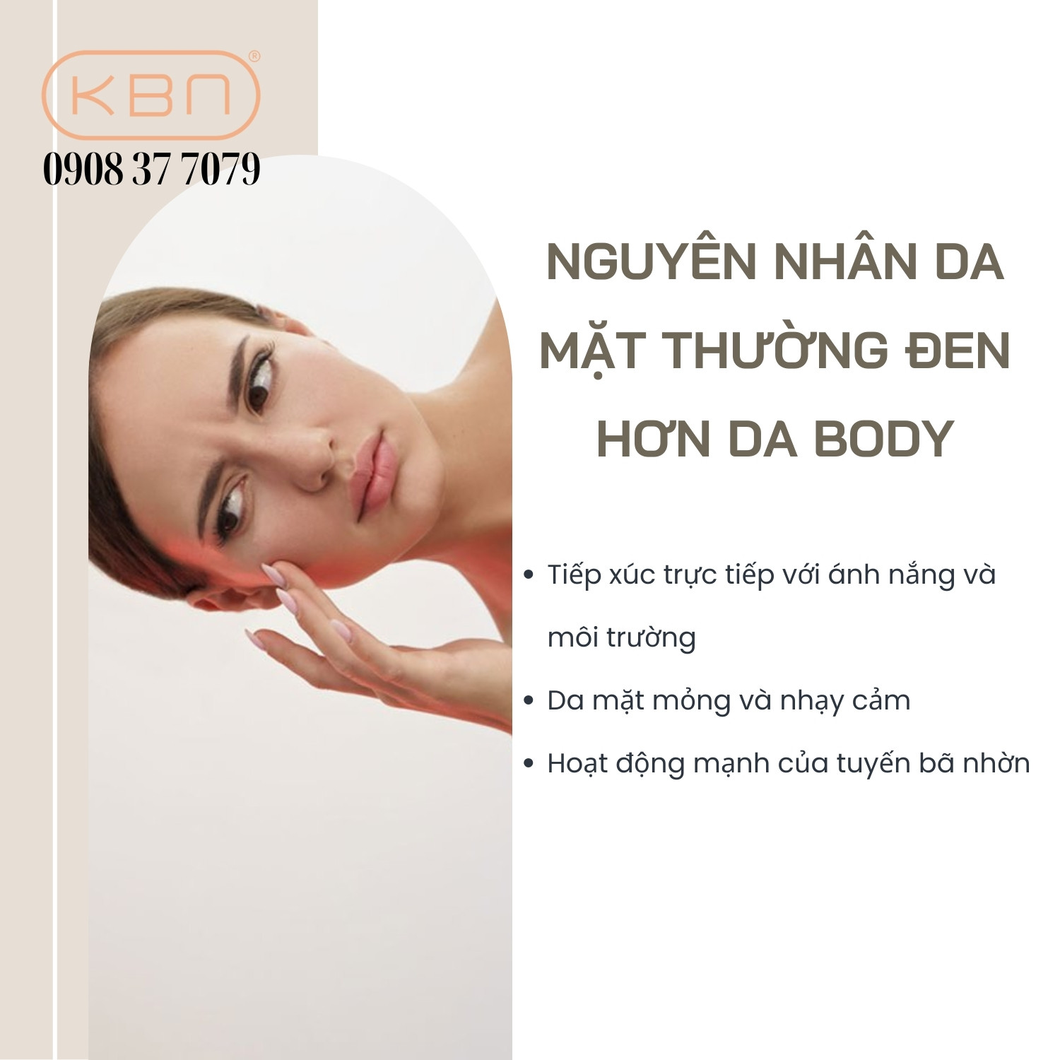 - Da mặt mỏng và nhạy cảm: So với da body, da mặt mỏng hơn, đặc biệt ở các vùng quanh mắt, má và trán. Lớp biểu bì mỏng và lớp hạ bì giàu mạch máu khiến da dễ bị tổn thương bởi các yếu tố môi trường. Điều này làm tăng nguy cơ sạm màu, viêm và kích ứng, khiến da mặt tối hơn so với da body.