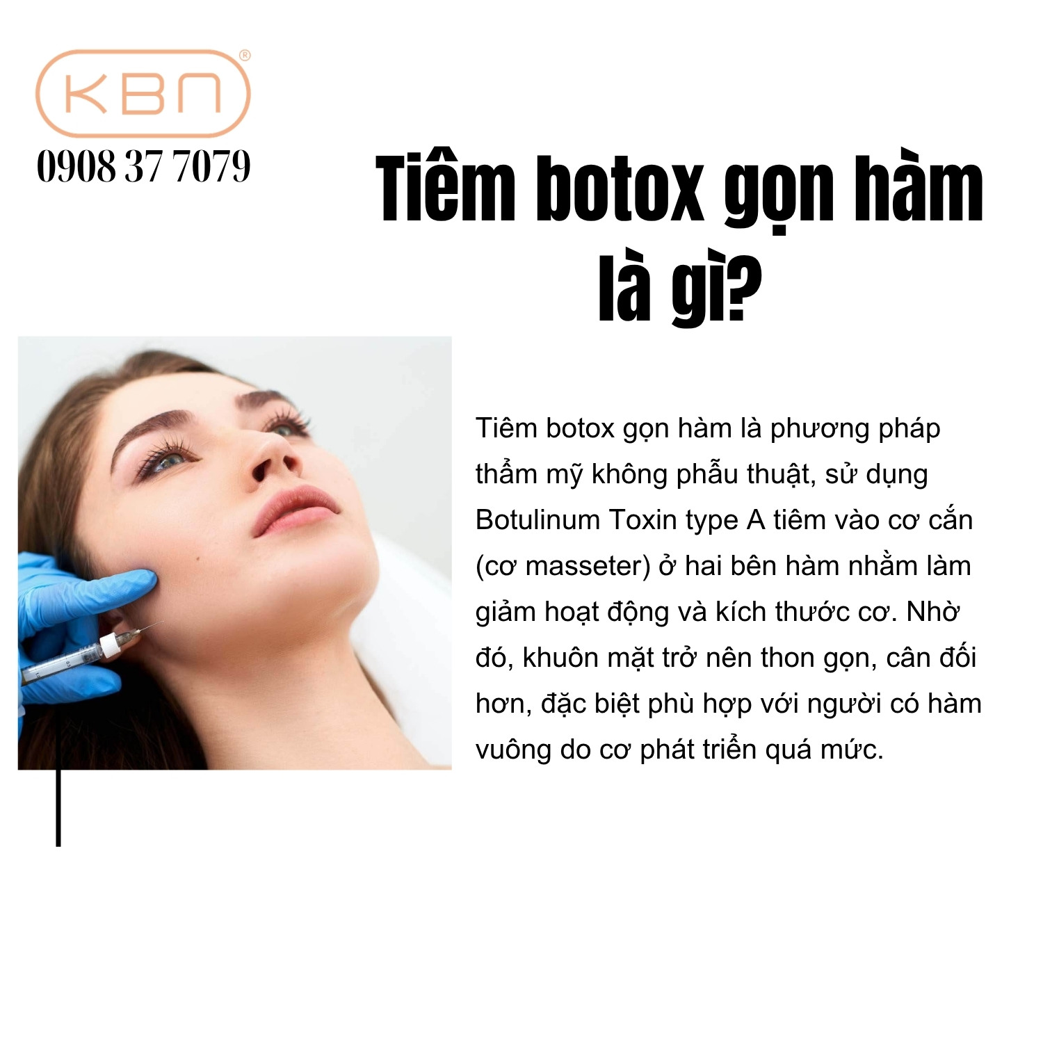 Botox là một loại protein tinh chế có nguồn gốc từ vi khuẩn Clostridium botulinum, được ứng dụng rộng rãi trong lĩnh vực y khoa và thẩm mỹ. Khi được tiêm với liều lượng phù hợp vào cơ thể, botox có khả năng ức chế dẫn truyền thần kinh tại chỗ, từ đó làm giảm hoạt động co cơ. Trong thẩm mỹ, cơ chế này được tận dụng để làm mờ nếp nhăn động và đặc biệt là thu nhỏ các nhóm cơ phát triển quá mức, điển hình như cơ hàm.