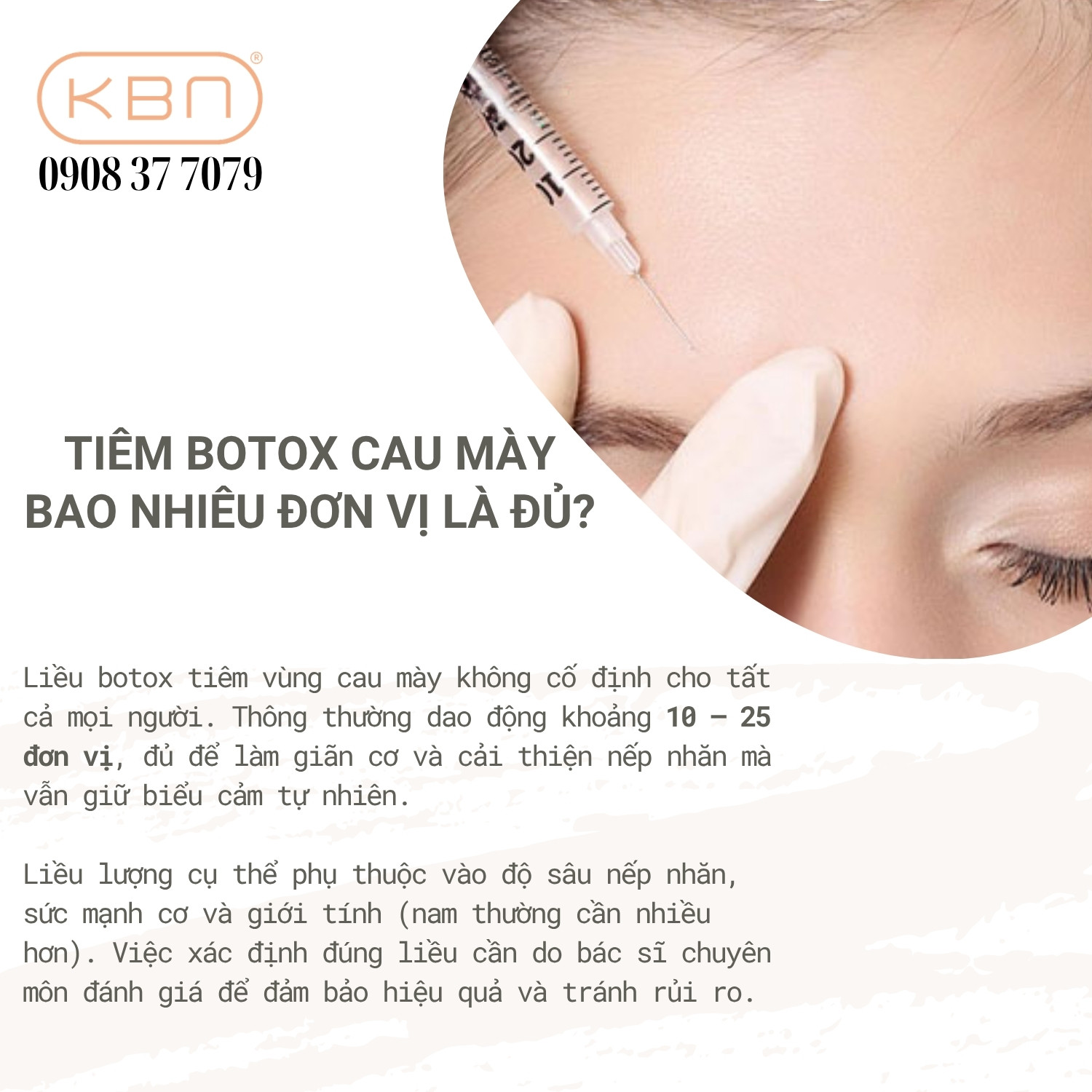 Tiêm botox cau mày bao nhiêu đơn vị là đủ là vấn đề không có một con số cố định cho tất cả mọi người, bởi liều lượng còn phụ thuộc vào tình trạng da và đặc điểm cơ mặt của từng cá nhân. Trong thực tế, vùng giữa hai lông mày (glabella) thường được chỉ định trong khoảng 10 – 25 đơn vị botox. Đây là mức liều phổ biến trong thẩm mỹ nội khoa, đủ để làm giãn cơ và cải thiện rõ rệt các nếp nhăn cau mày mà vẫn đảm bảo sự tự nhiên cho biểu cảm khuôn mặt.