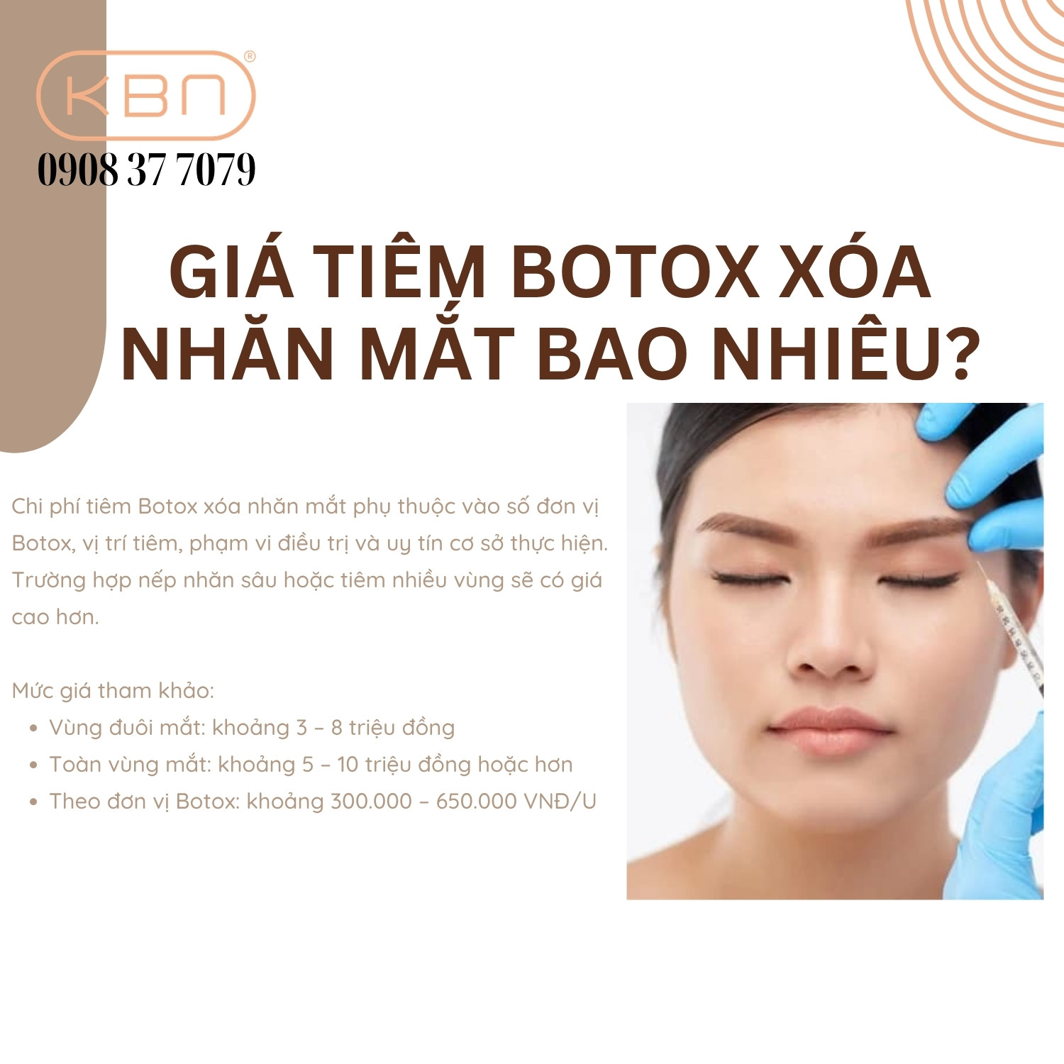 Hiện nay, tiêm botox xóa nhăn đuôi mắt giá bao nhiêu còn tùy thuộc vào từng cơ sở, nhưng mức phổ biến dao động khoảng từ 3.000.000 đến 8.000.000 VNĐ cho vùng đuôi mắt. Đây là lựa chọn phổ biến cho những người muốn cải thiện vết chân chim nhẹ đến trung bình.