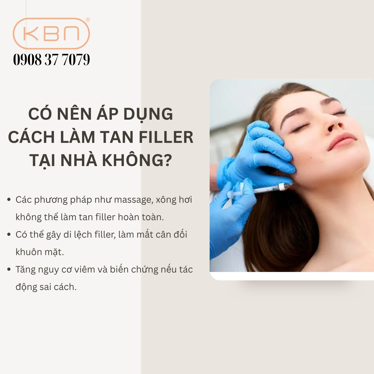 Nhiều người lựa chọn cách làm tan filler tại nhà bằng các phương pháp như massage, xông hơi hoặc chườm nóng với hy vọng đẩy nhanh quá trình phân hủy. Tuy nhiên, trên thực tế, những tác động này không đủ khả năng phá vỡ cấu trúc của filler, đặc biệt là filler chứa axit hyaluronic. Quá trình phân giải filler cần đến enzyme chuyên biệt hoặc can thiệp y khoa, do đó các phương pháp tại nhà chỉ mang tính hỗ trợ rất hạn chế và không thể thay thế điều trị chuyên sâu.